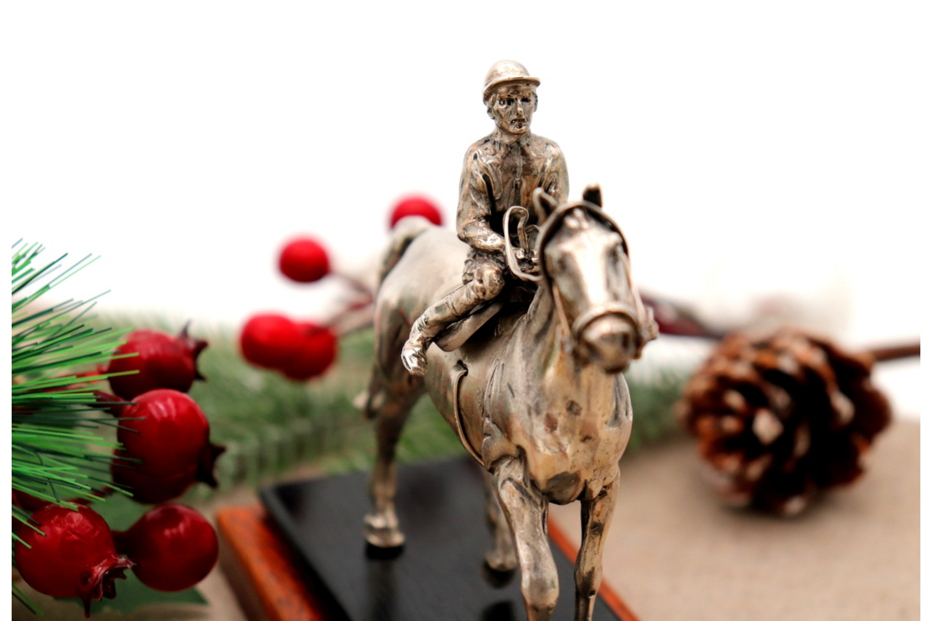 Miniatura de cavalo e jockey em prata de vulto perfeito com aplicações e relevo