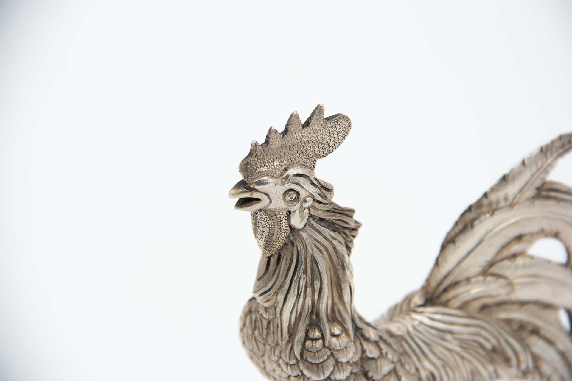 • Descrição: Galo em prata com baixos relevos e em posição erecta.