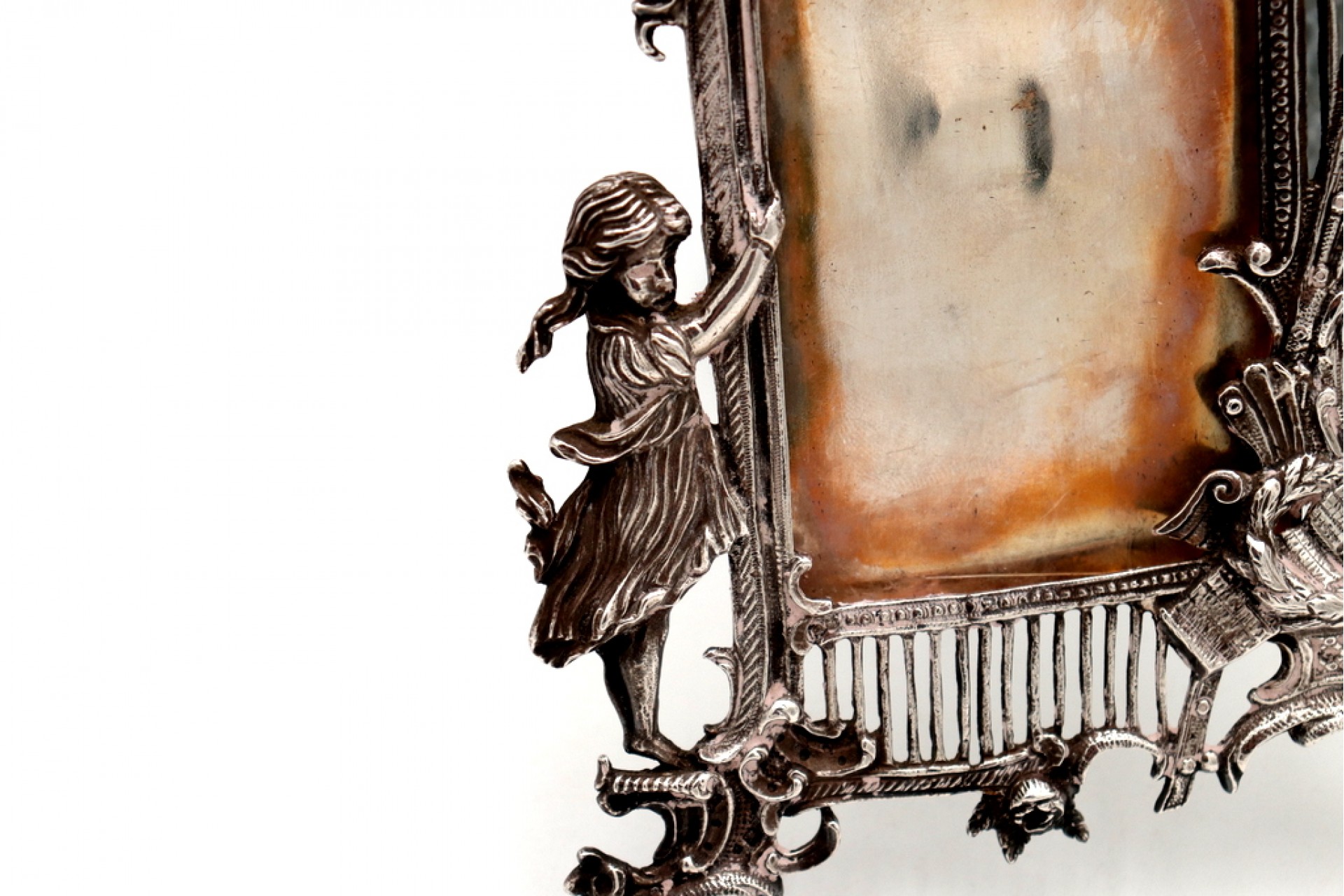 • Descrição: Moldura em prata com relevos e aplicações de criança e anjo.
