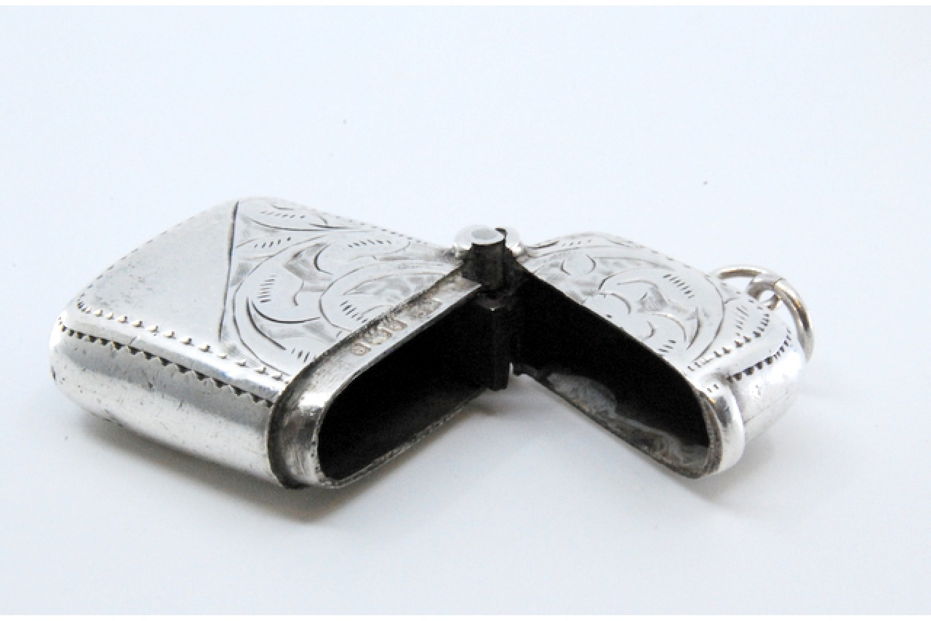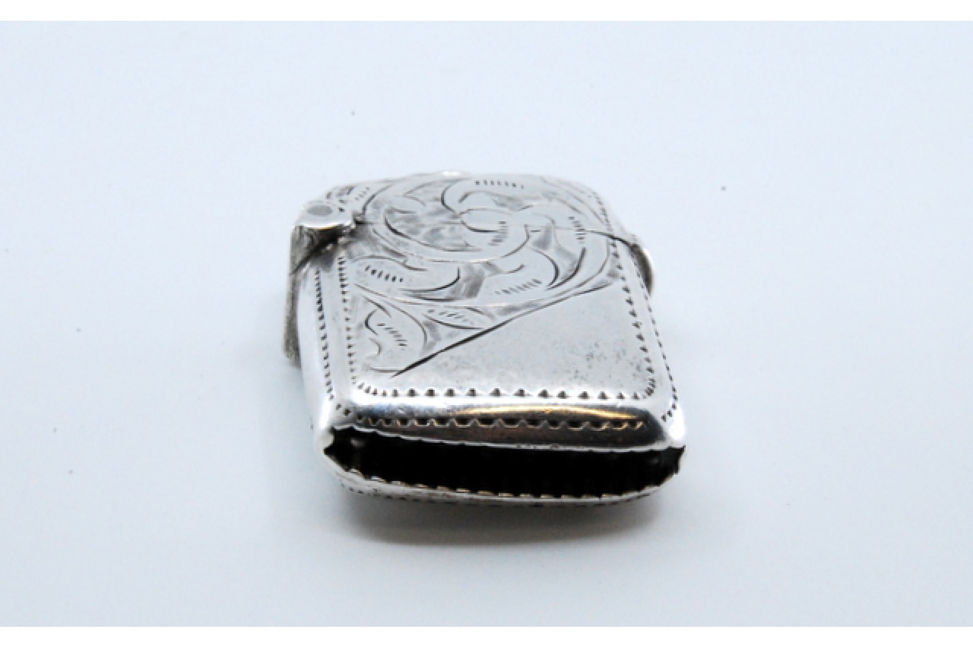 • Descrição: Fosforeira em prata com motivos vegetalistas gravados envolvendo cartela para monograma e tampa basculante.