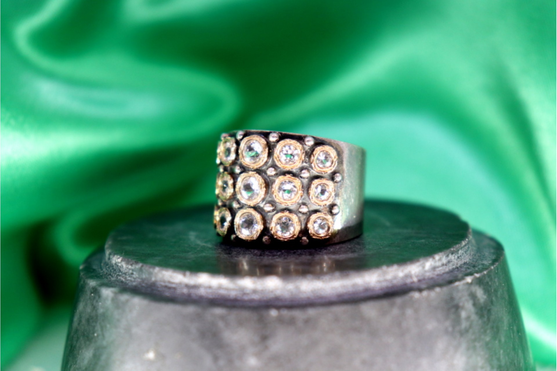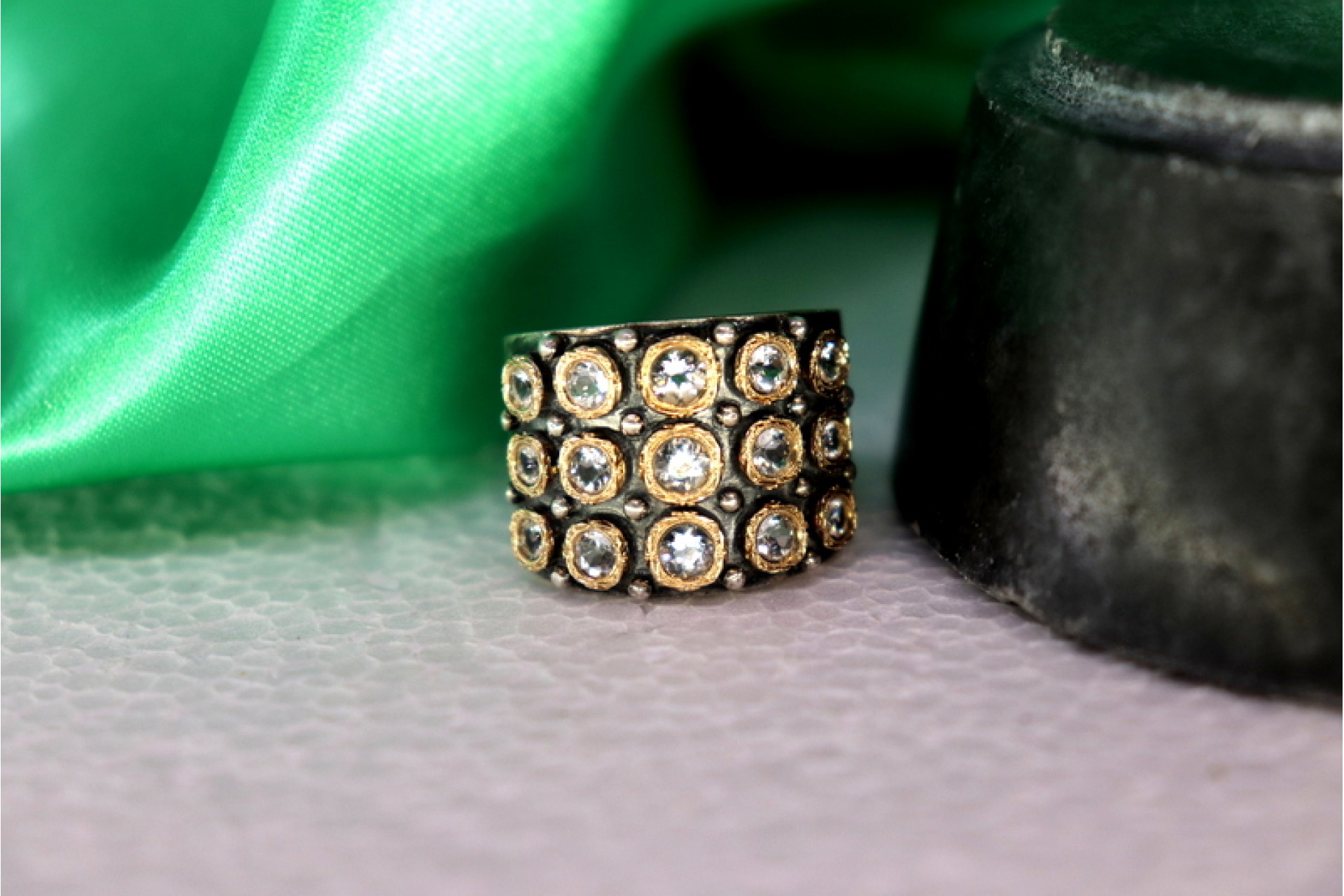 Anel em ouro e prata com quinze zircónias incrustadas.
