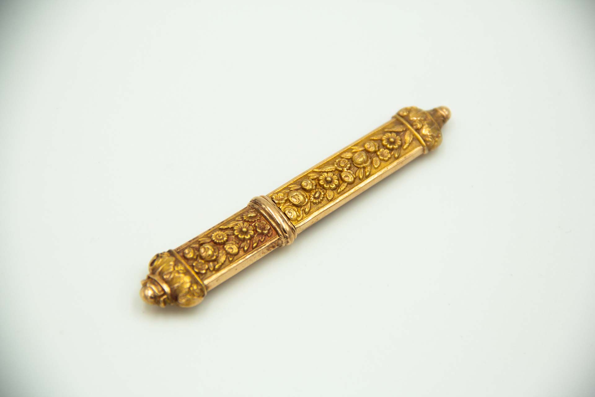 • Descrição: Agulheiro em ouro amarelo com motivos florais relevados.
