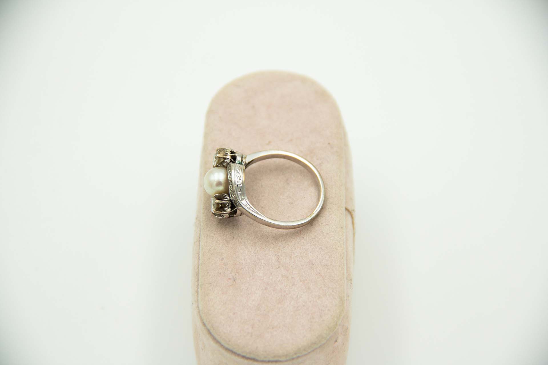 • Descrição: Anel em ouro branco com pérola de cultura e diamantes (2) em talhe brilhante  e 10 em 8/8.
