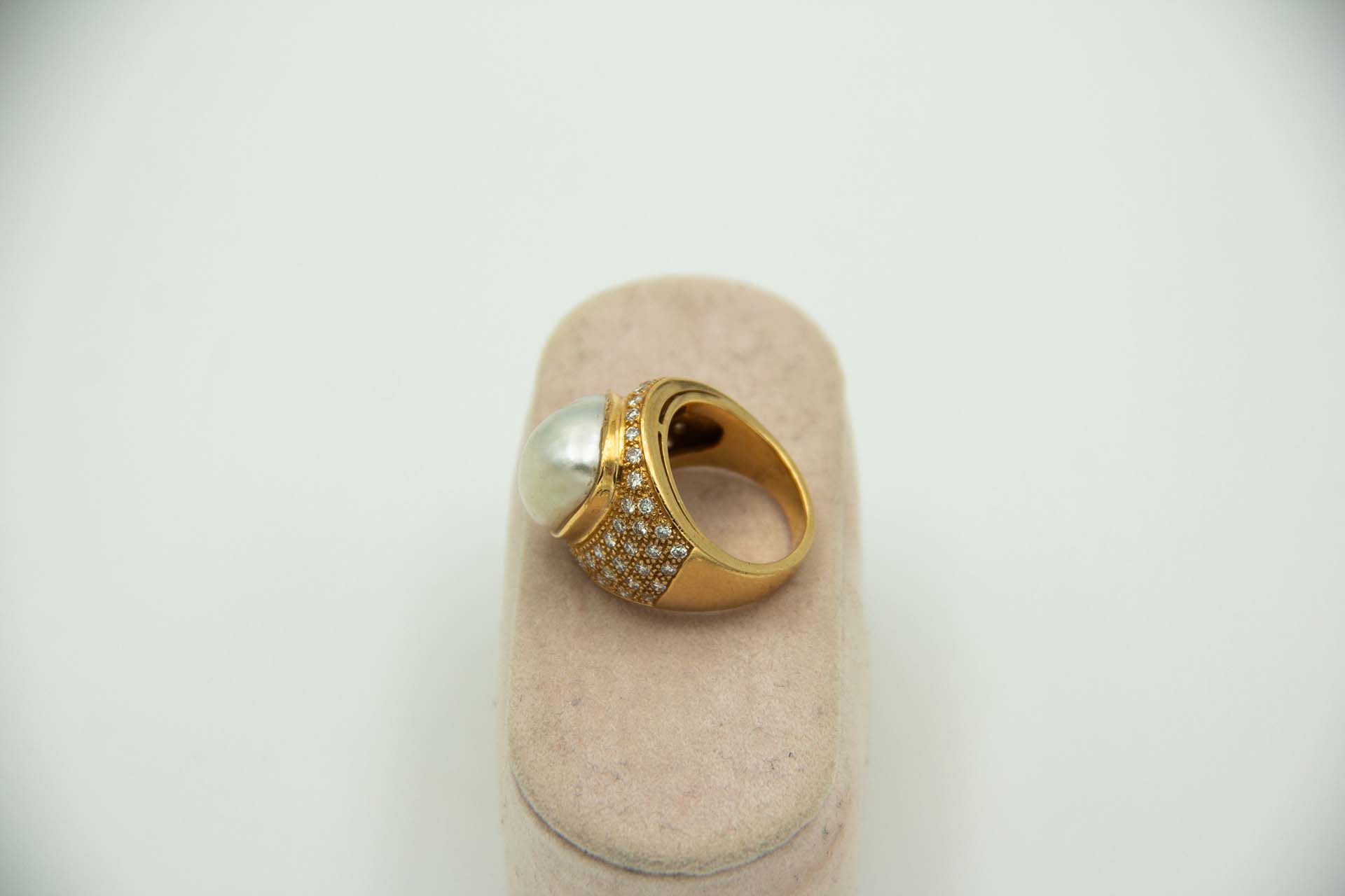 Anel de ouro amarelo com pérola barroca e diamantes (56) em talhe brilante 8/8.