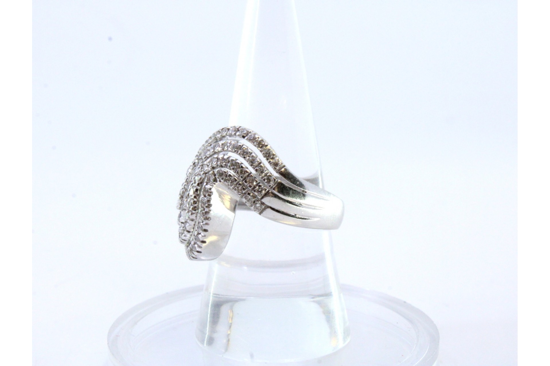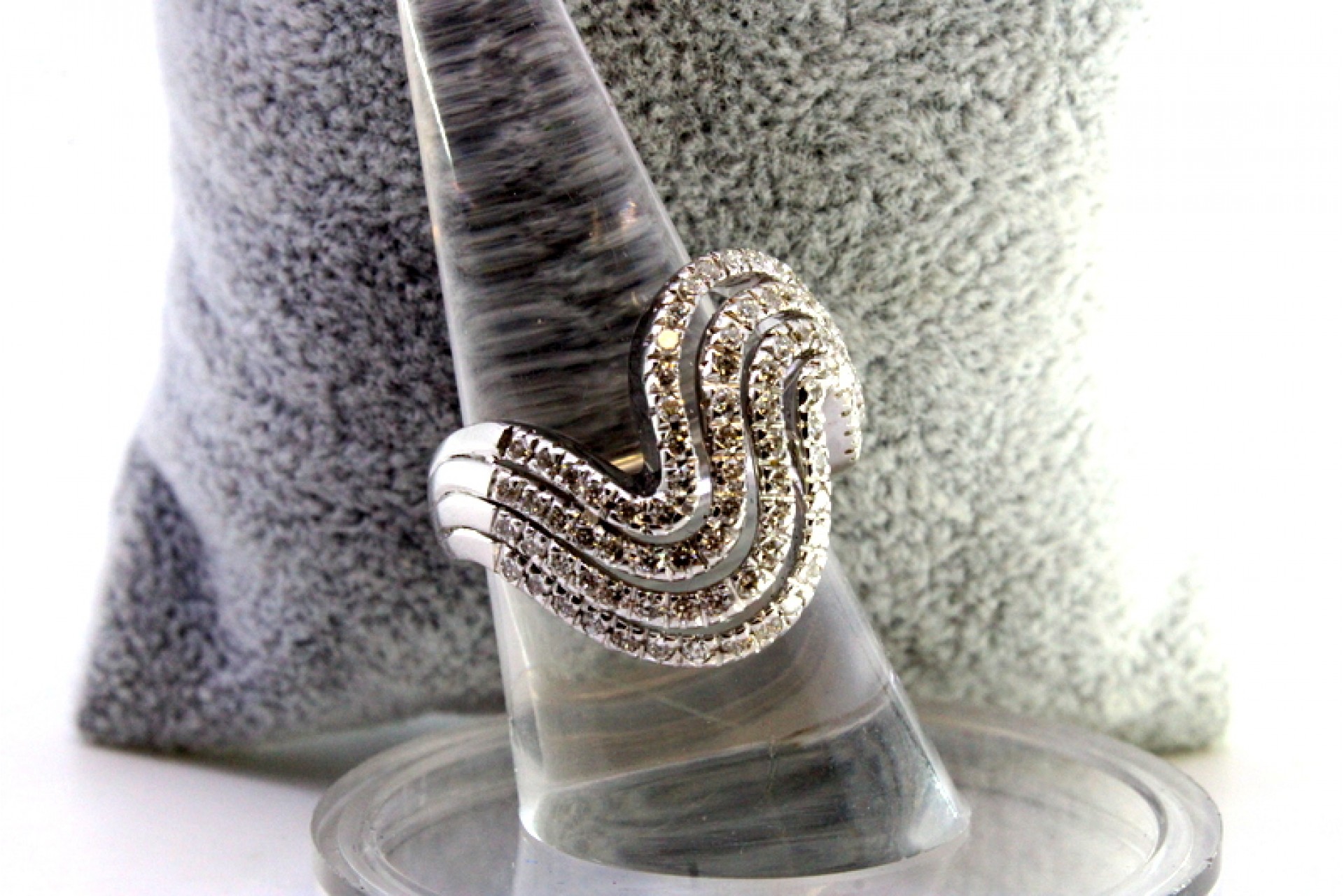 Anel em ouro branco com diamantes em talhe brilhante e quatro bandas ondeadas.