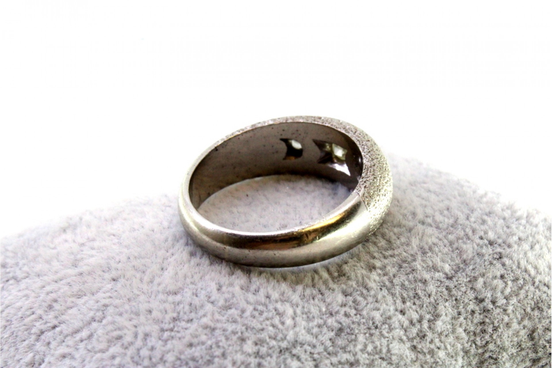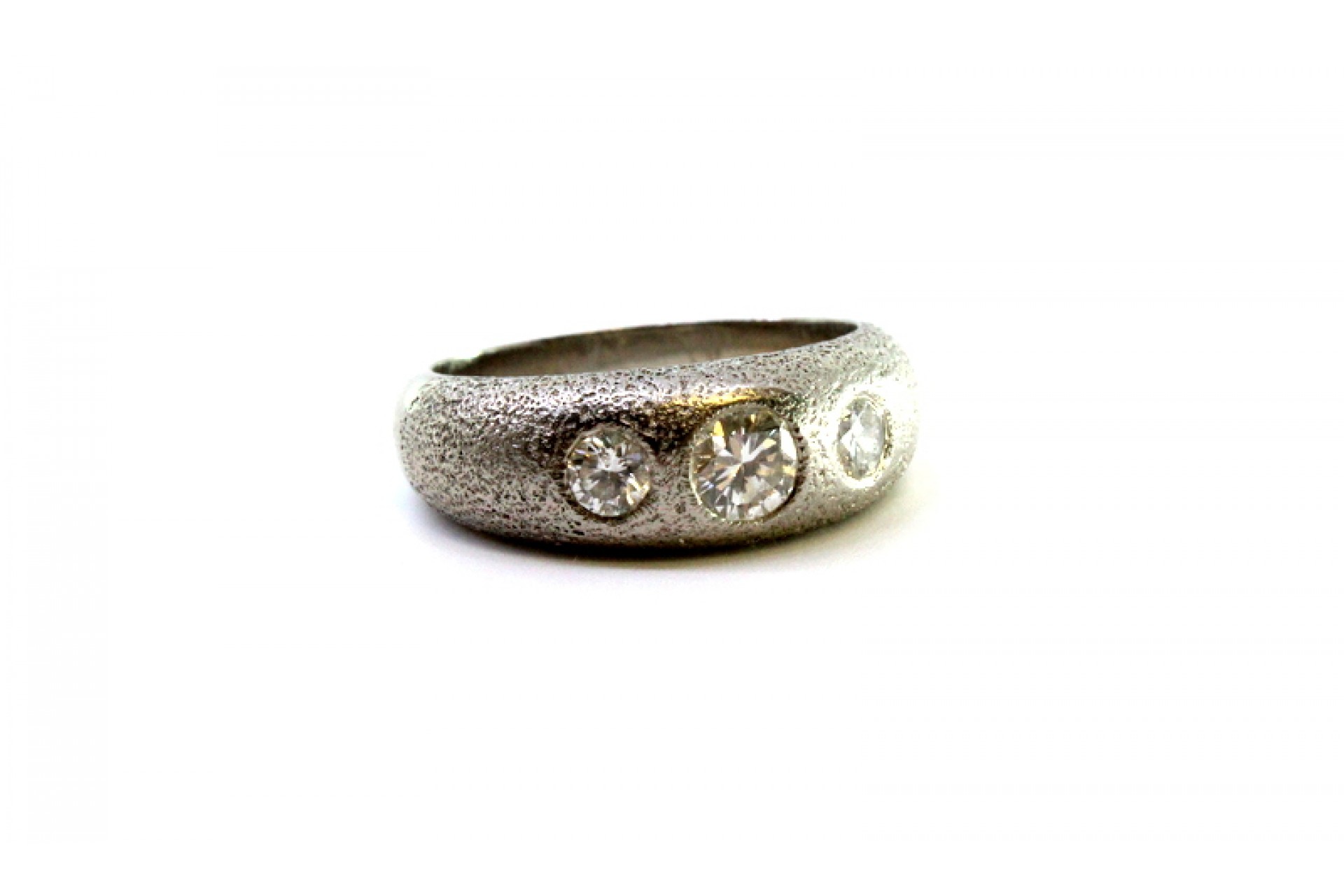 Anel em ouro branco com três diamantes em talhe brilhante com cravação inglesa.