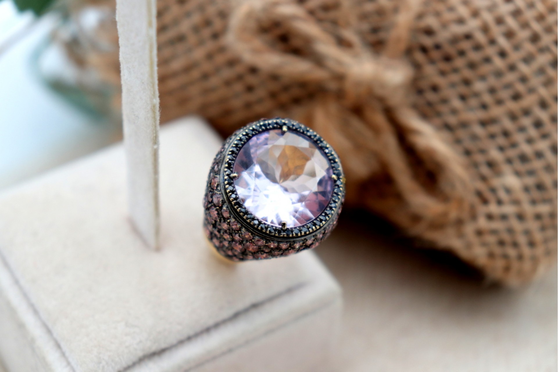 • Descrição: Anel em ouro com jadeite lapidada no centro e quartzo lapidados.