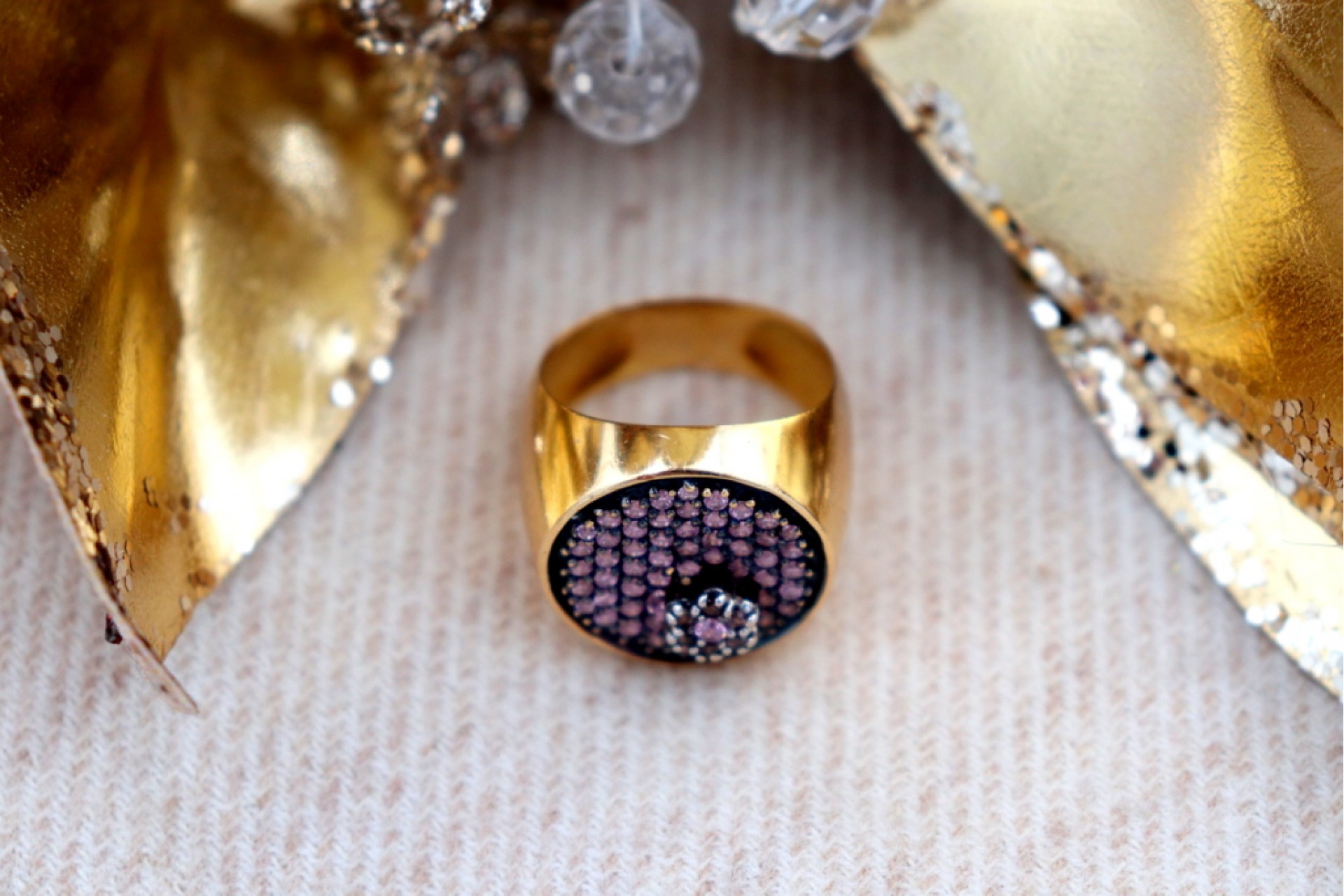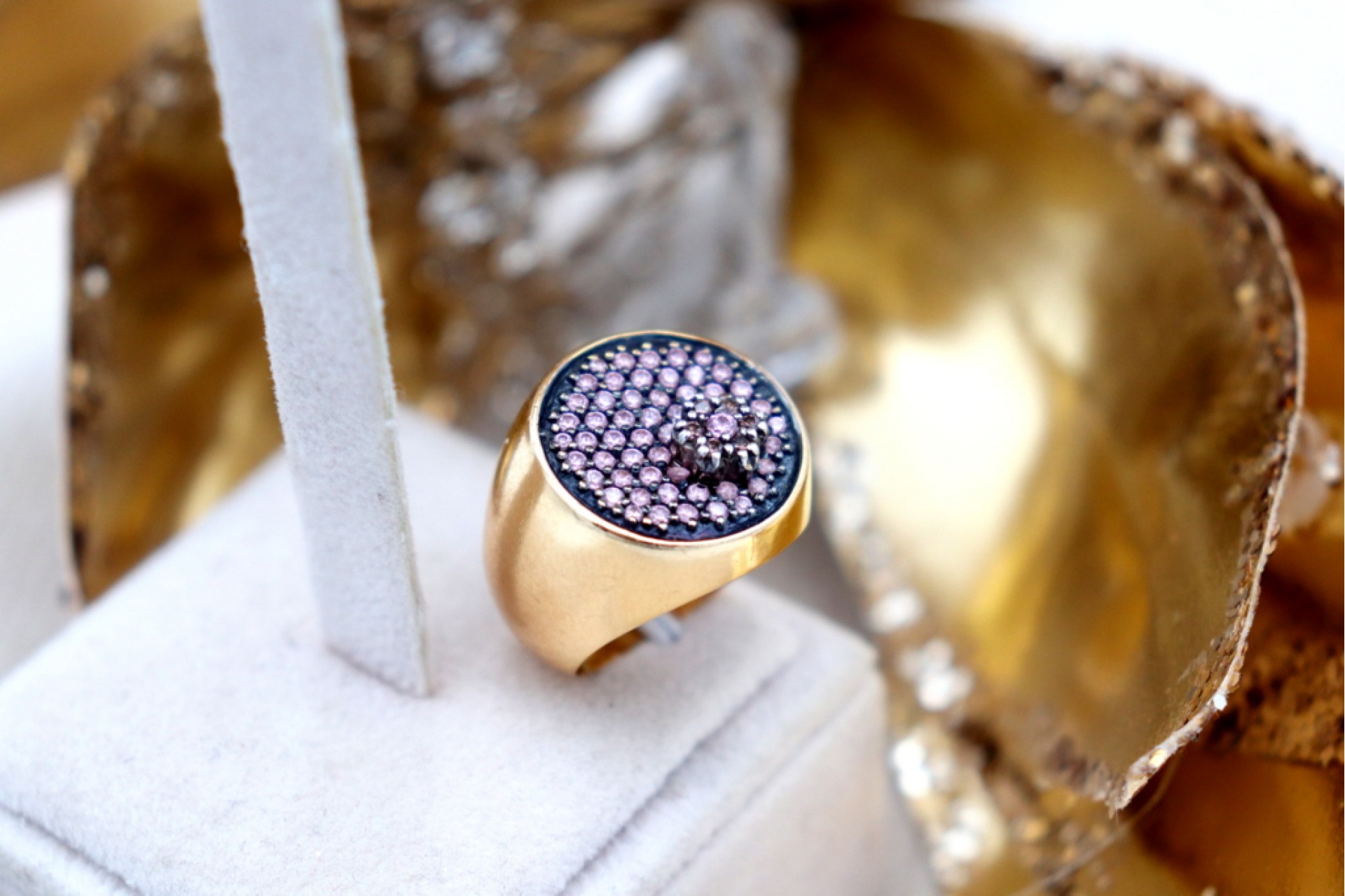 • Descrição: Anel em ouro com mesa circular, ametistas lapidadas e aplicação de flor em alto relevada.