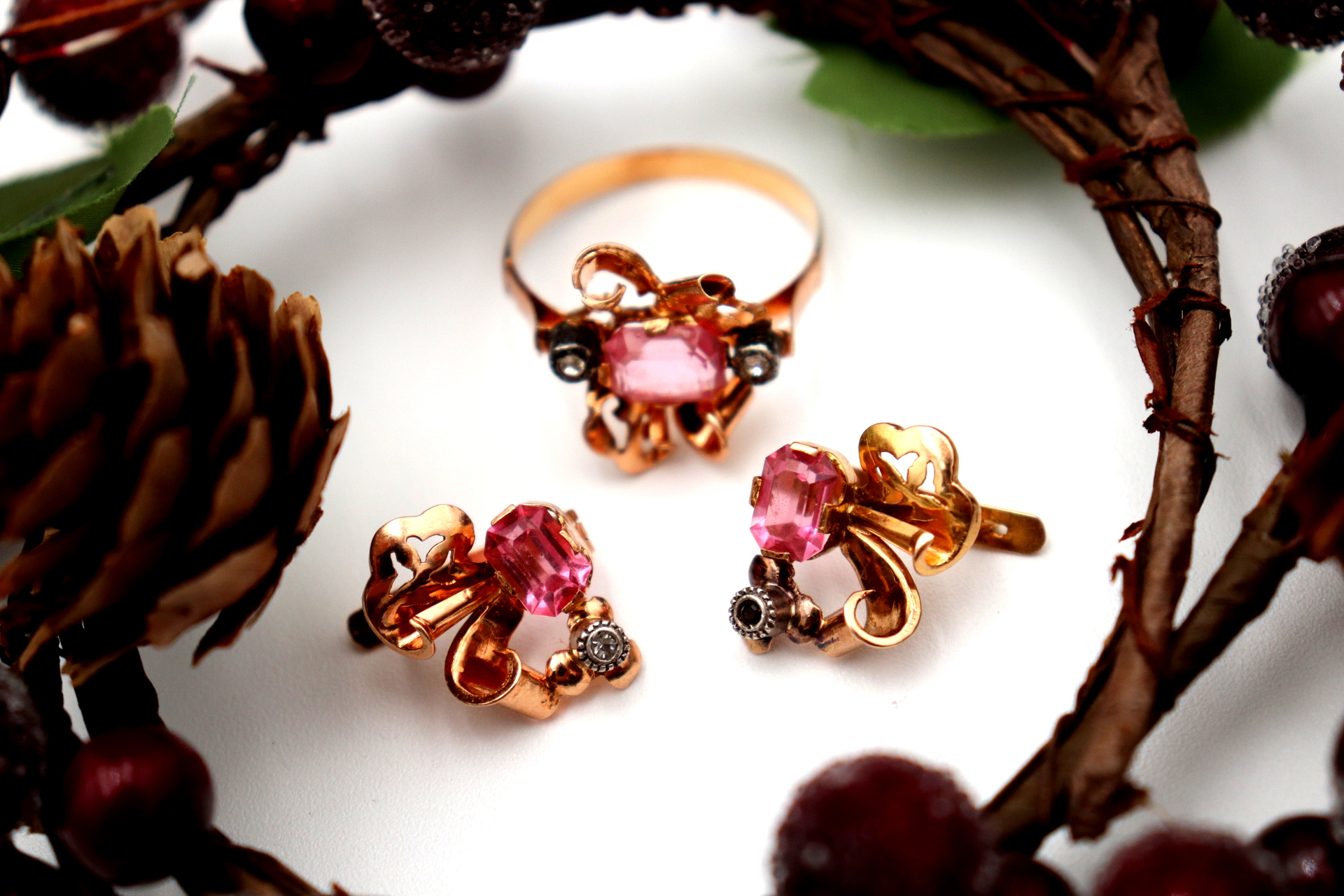 Conjunto de adereço em ouro composto por brincos e anel com pedras sintéticas