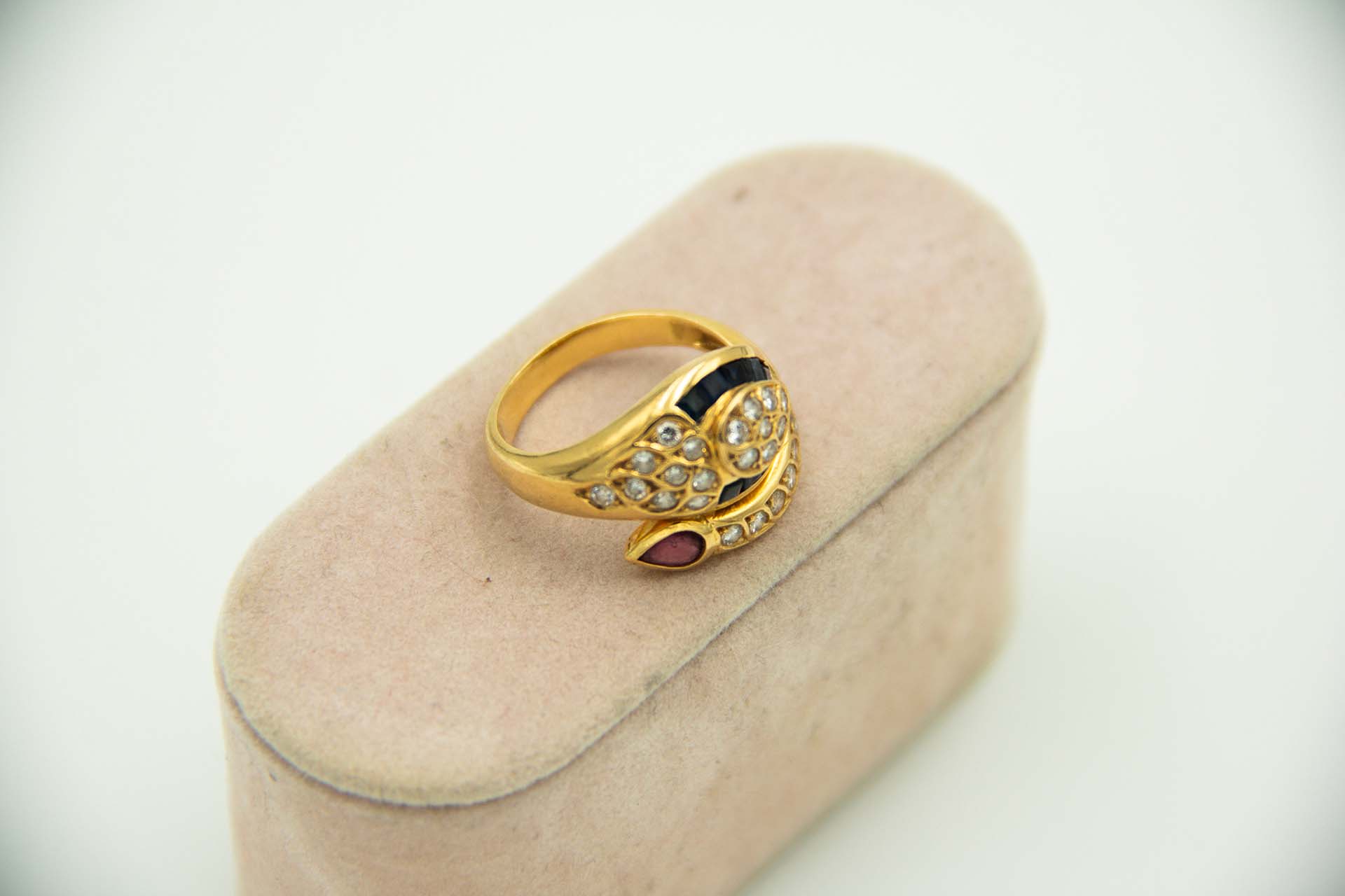 • Descrição:  Anel de ouro amarelo com diamantes (24) em talhe brilhante, rubi e safiras australianas calibradas.