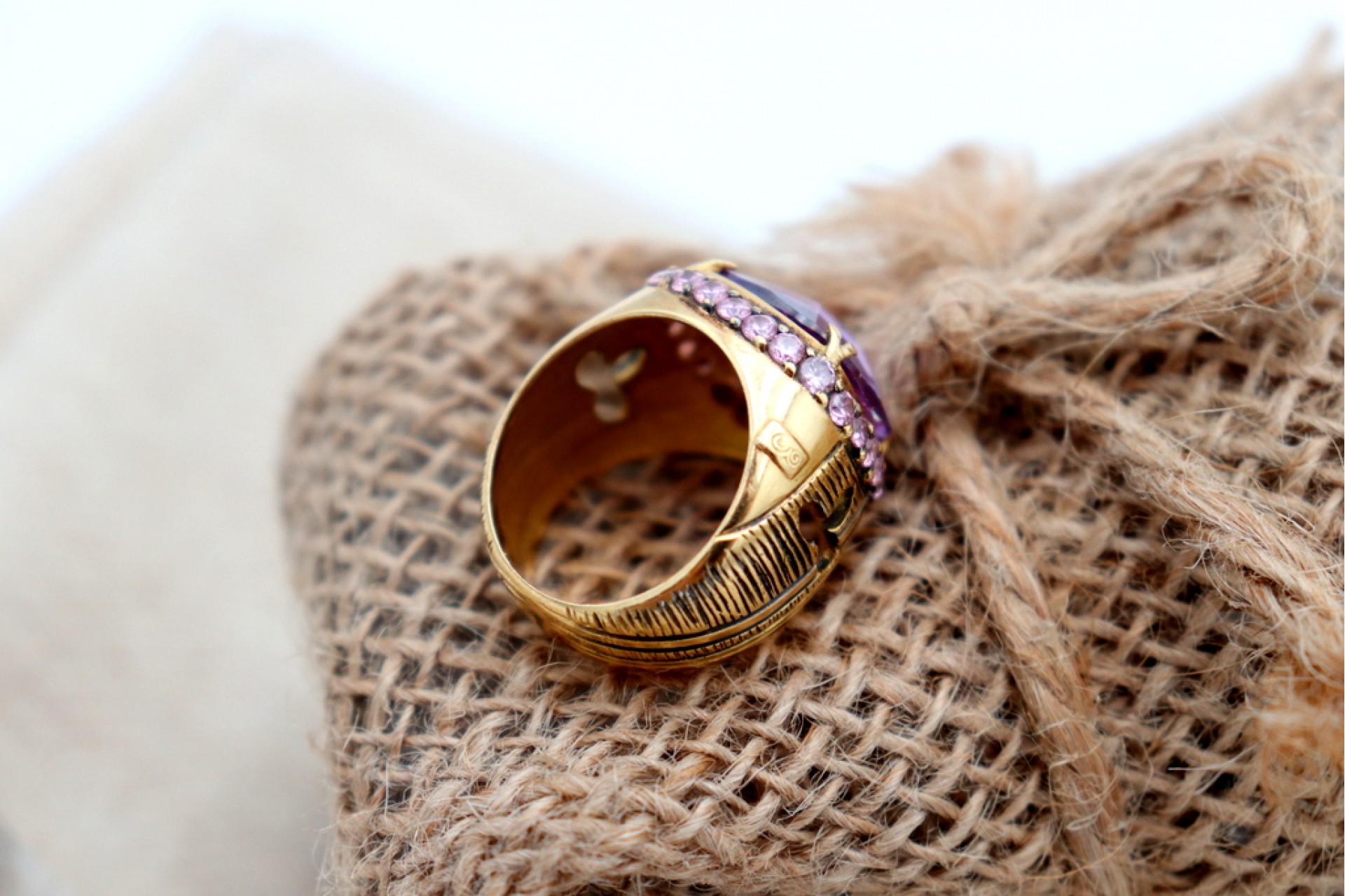• Descrição: Anel em ouro com recortes, ametista lapidada no centro e friso envolvente com ametistas calibradas.