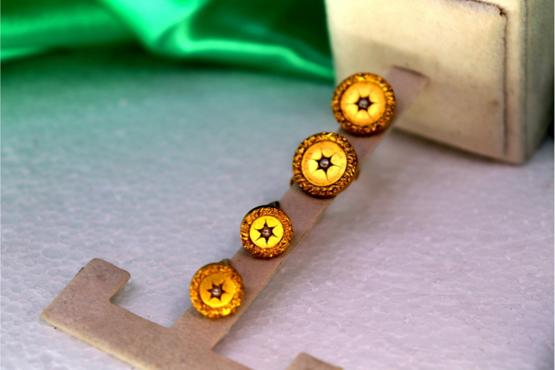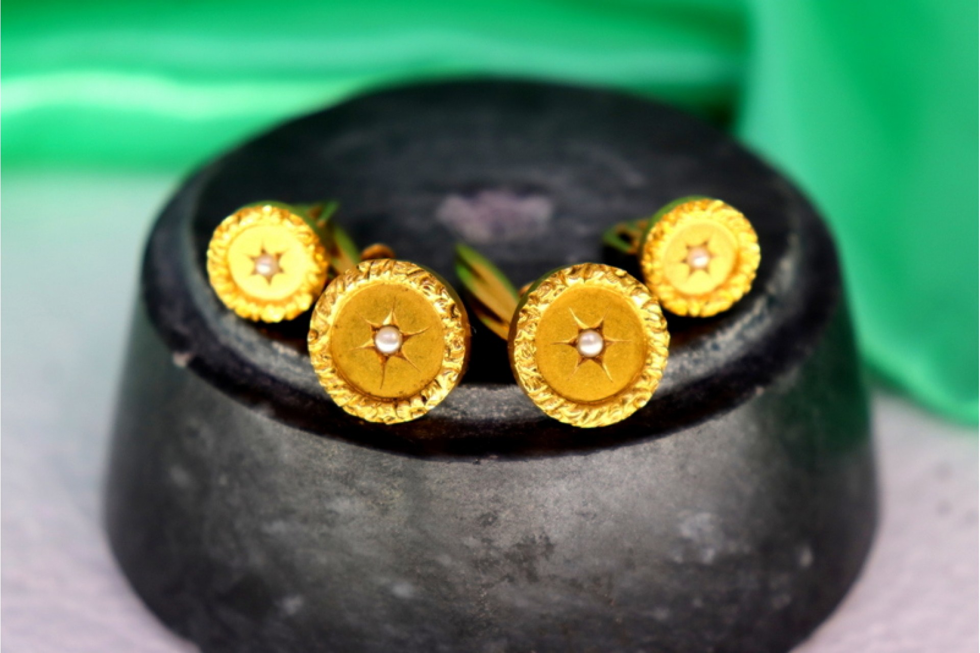 • Descrição: Botões de punho com abotoaduras em ouro com relevos nas travessas e pérolas no centro.