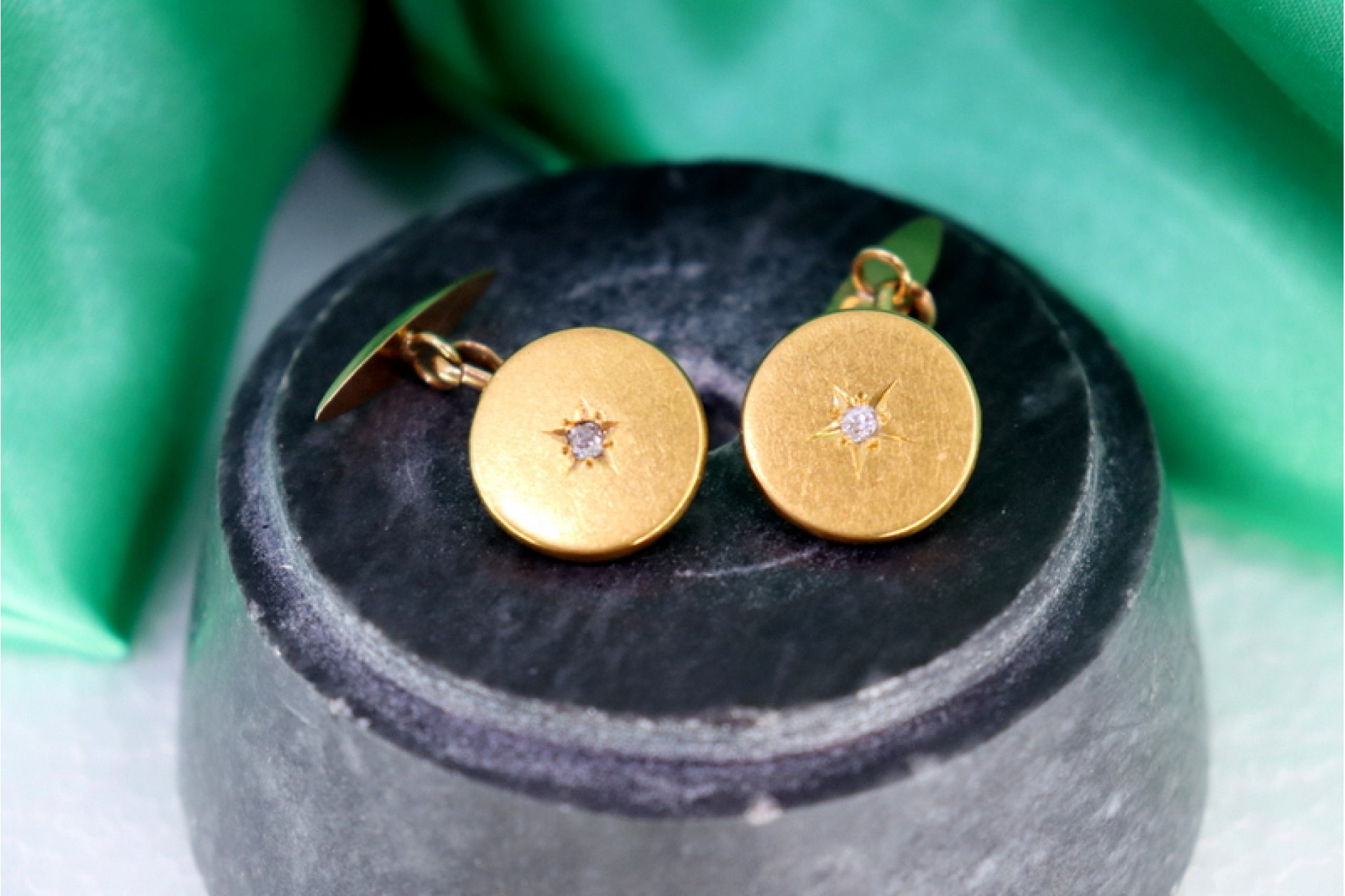 • Descrição: Botões de punho em ouro em formato de botão com recortes em forma de estrela para diamantes em talhe brilhante no centro.