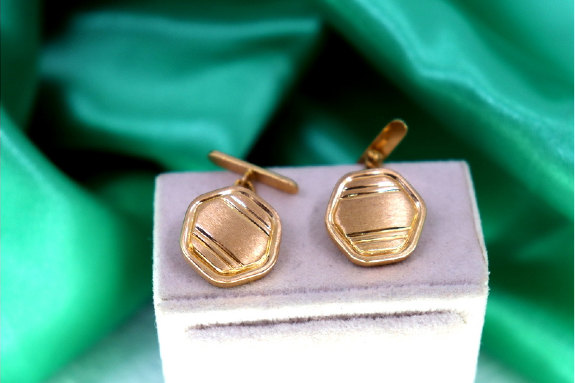 • Descrição: Botões de punho em ouro de formato sextavado com relevos foscos e frisos relevados.