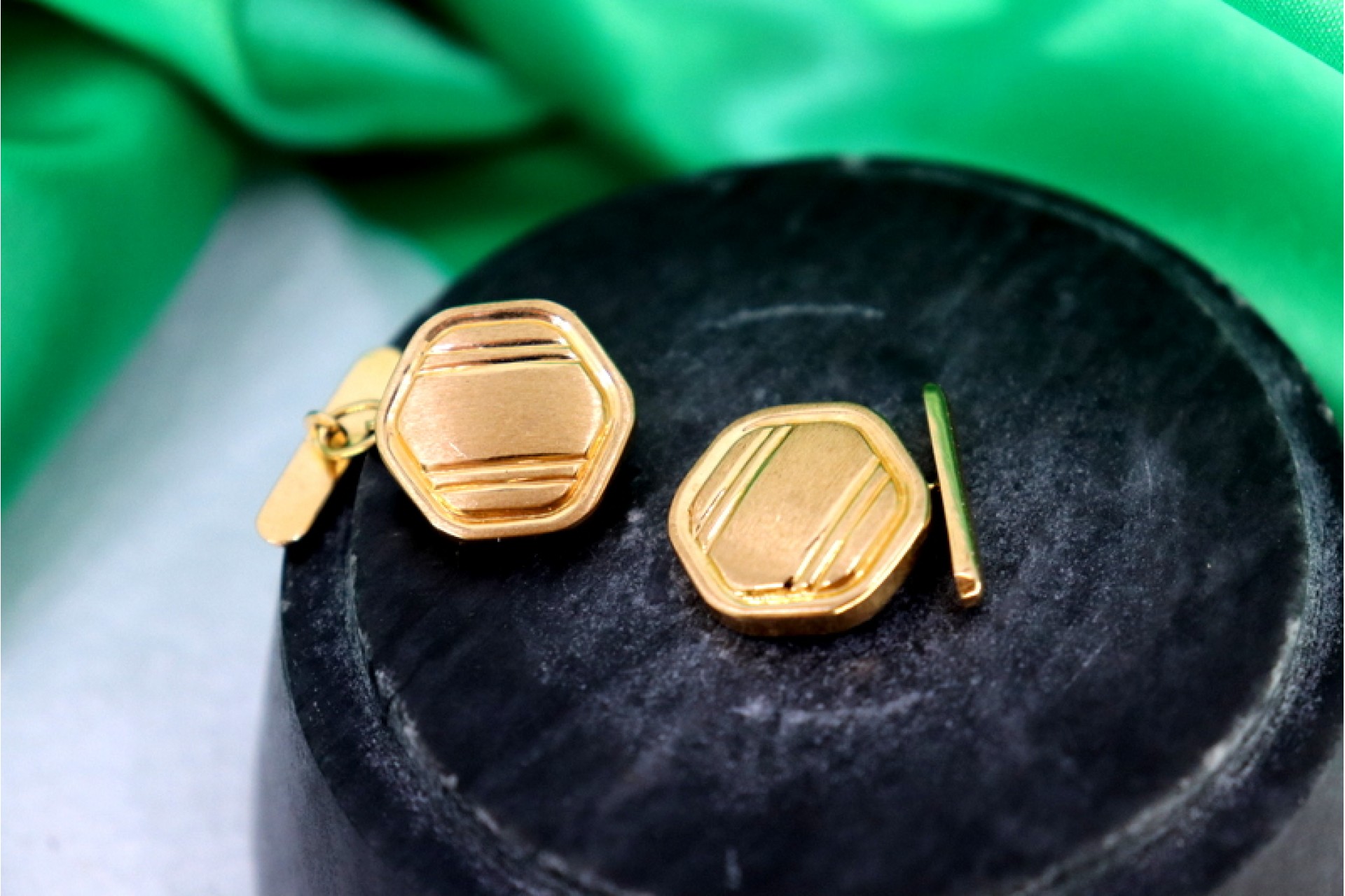 Botões de punho em ouro de formato sextavado com relevos foscos e frisos