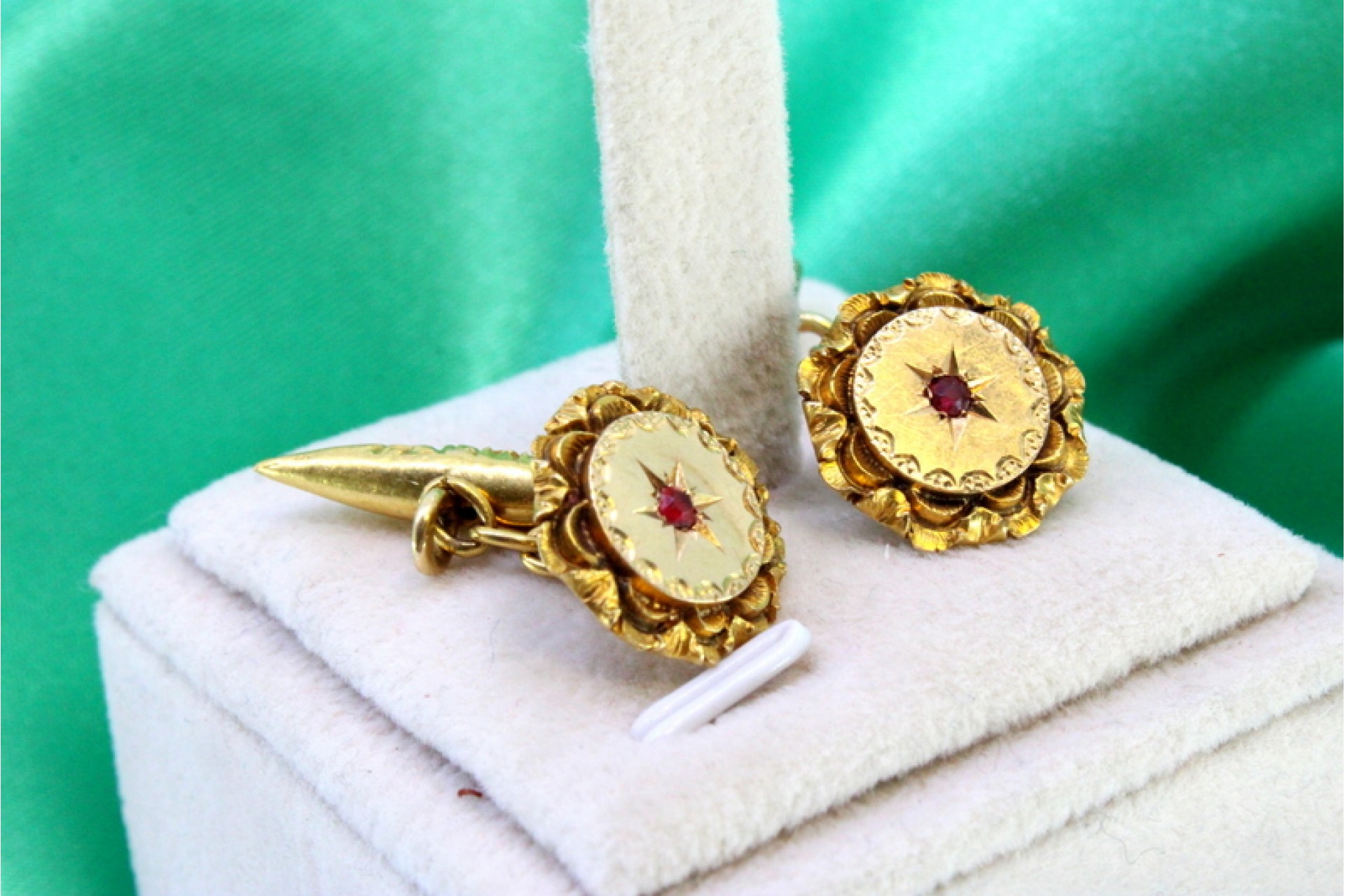 Botões de punho em ouro dourado com relevos revelados e pedra vermelha ao centro