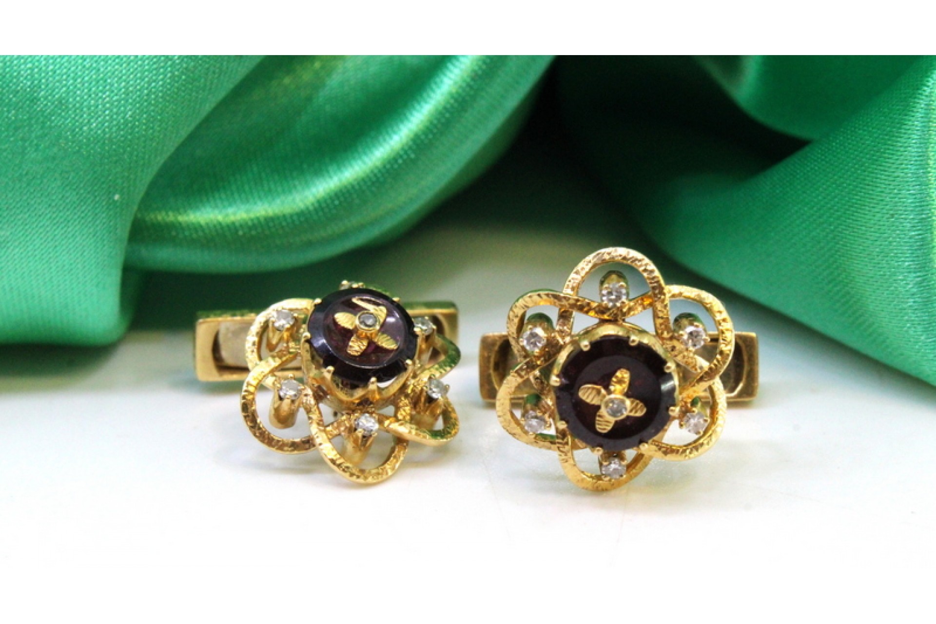 • Descrição: Botões de punho em ouro em forma de flores com onix no centro e doze (12) diamantes em talhe brilhante.