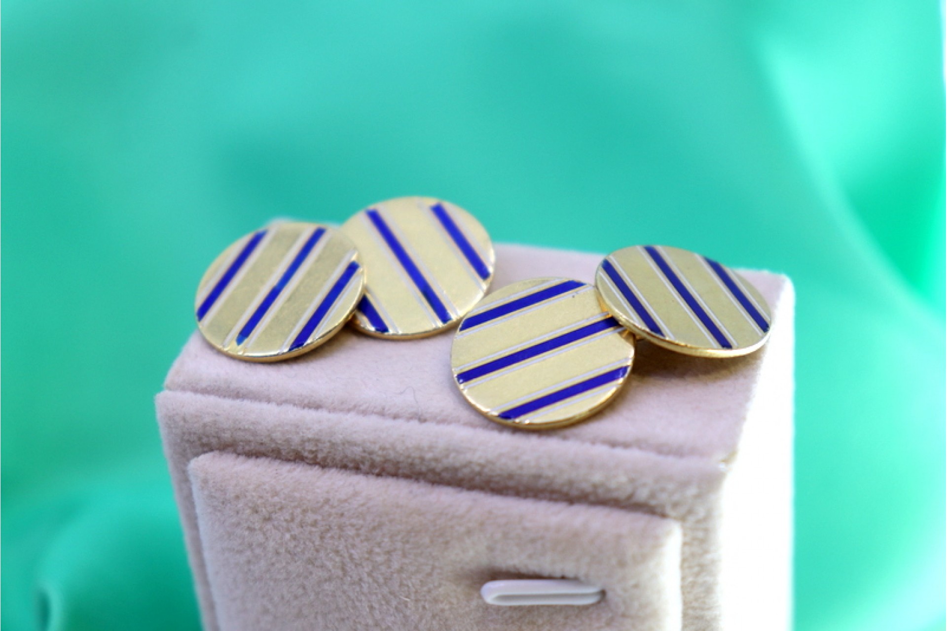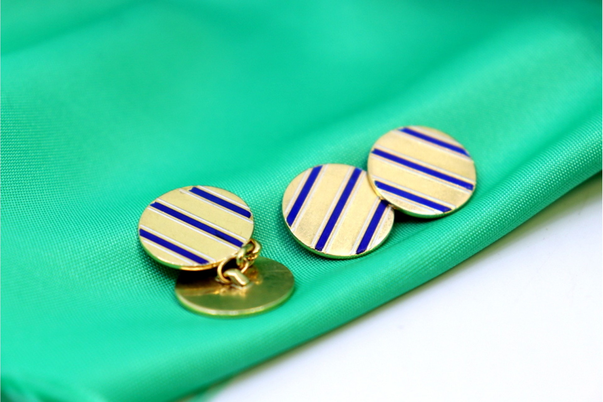 • Descrição: Botões de punho em ouro em formato de botão com três faixas esmaltadas em azul.