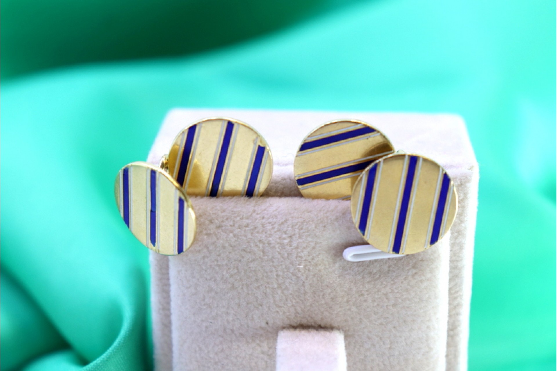 Botões de punho em ouro em formato de botão com três faixas esmaltadas em azul.