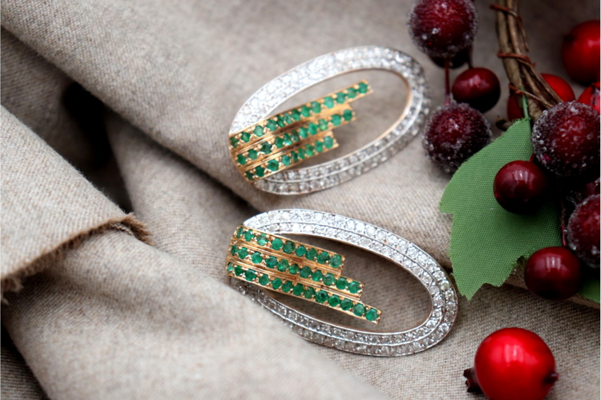 • Descrição: Brincos em ouro de formato ilíptico com diamantes (160) em talhe brilhante e esmeraldas (66) calibradas.