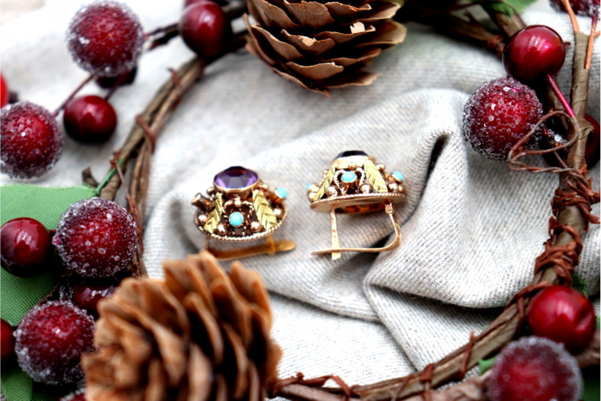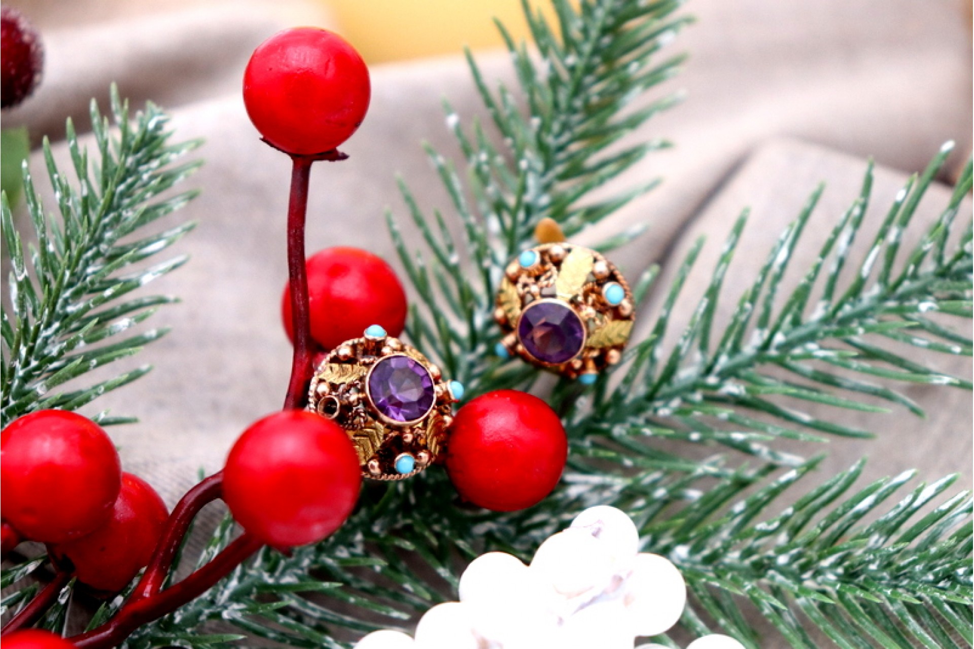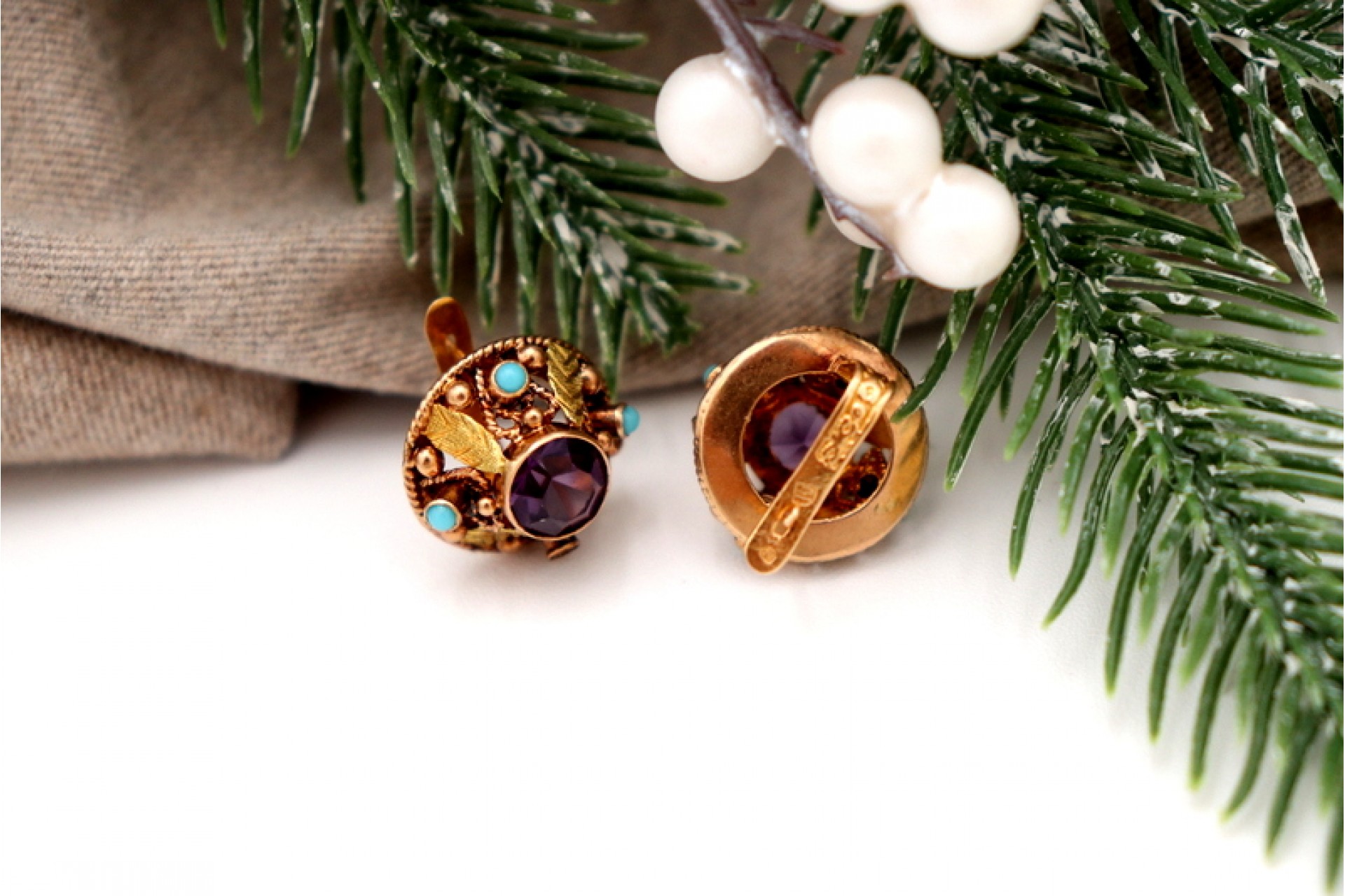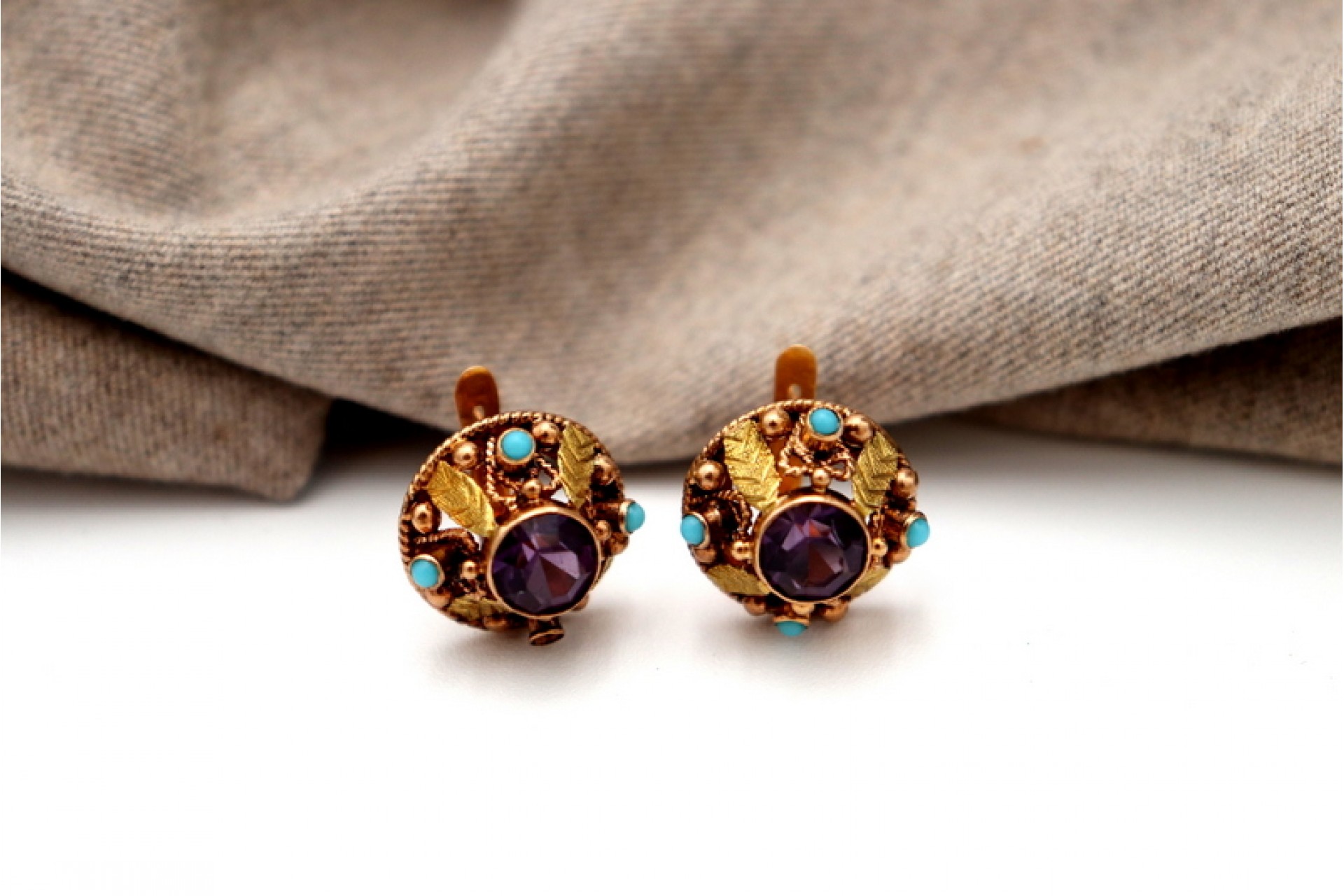 • Descrição: Brincos em ouro de formato circular e recortado, ametistas lapidadas e turquesas incrustadas.