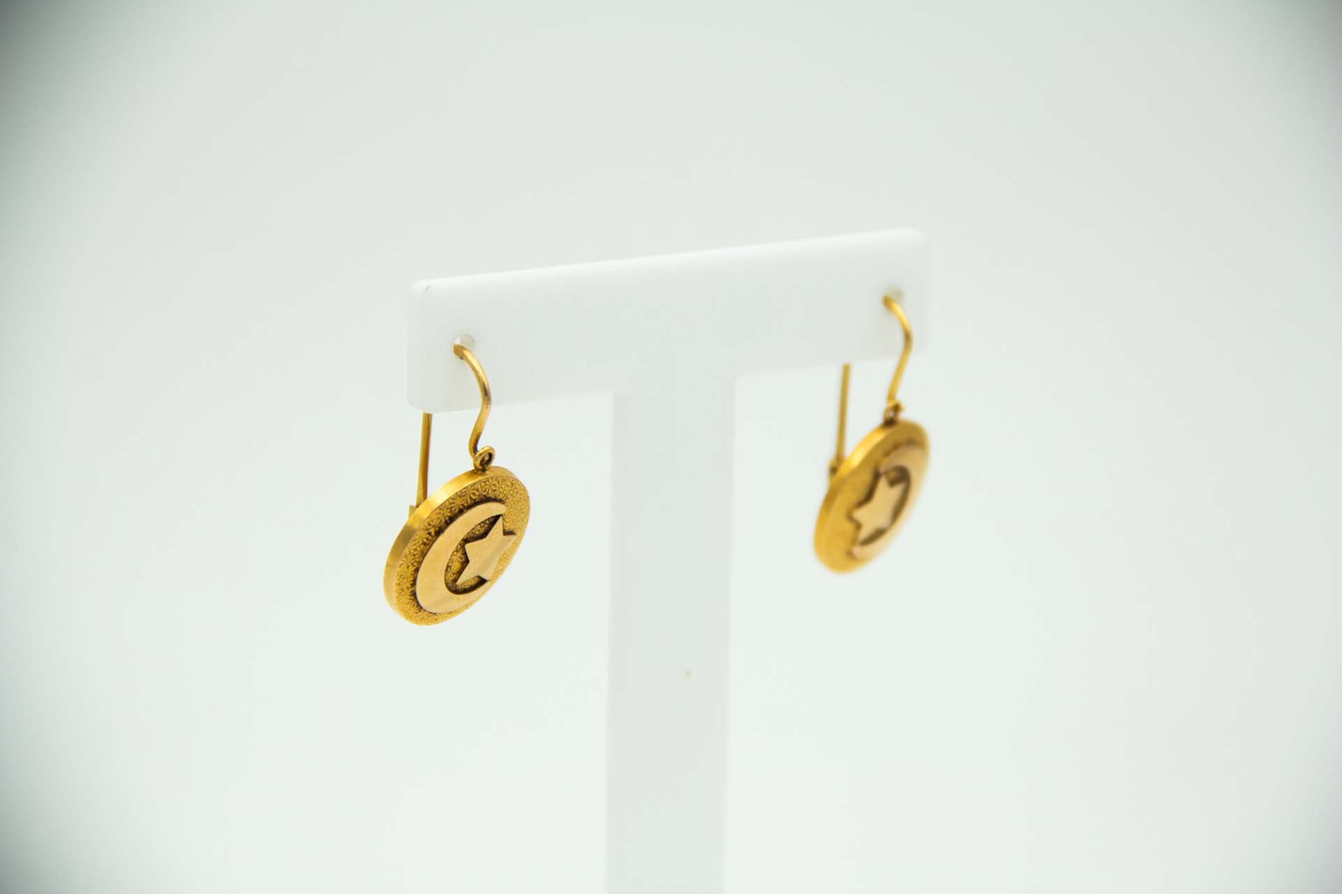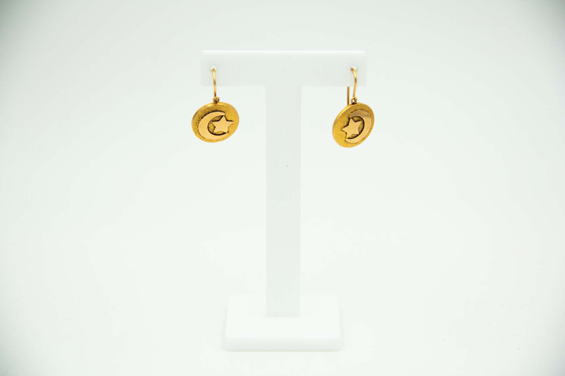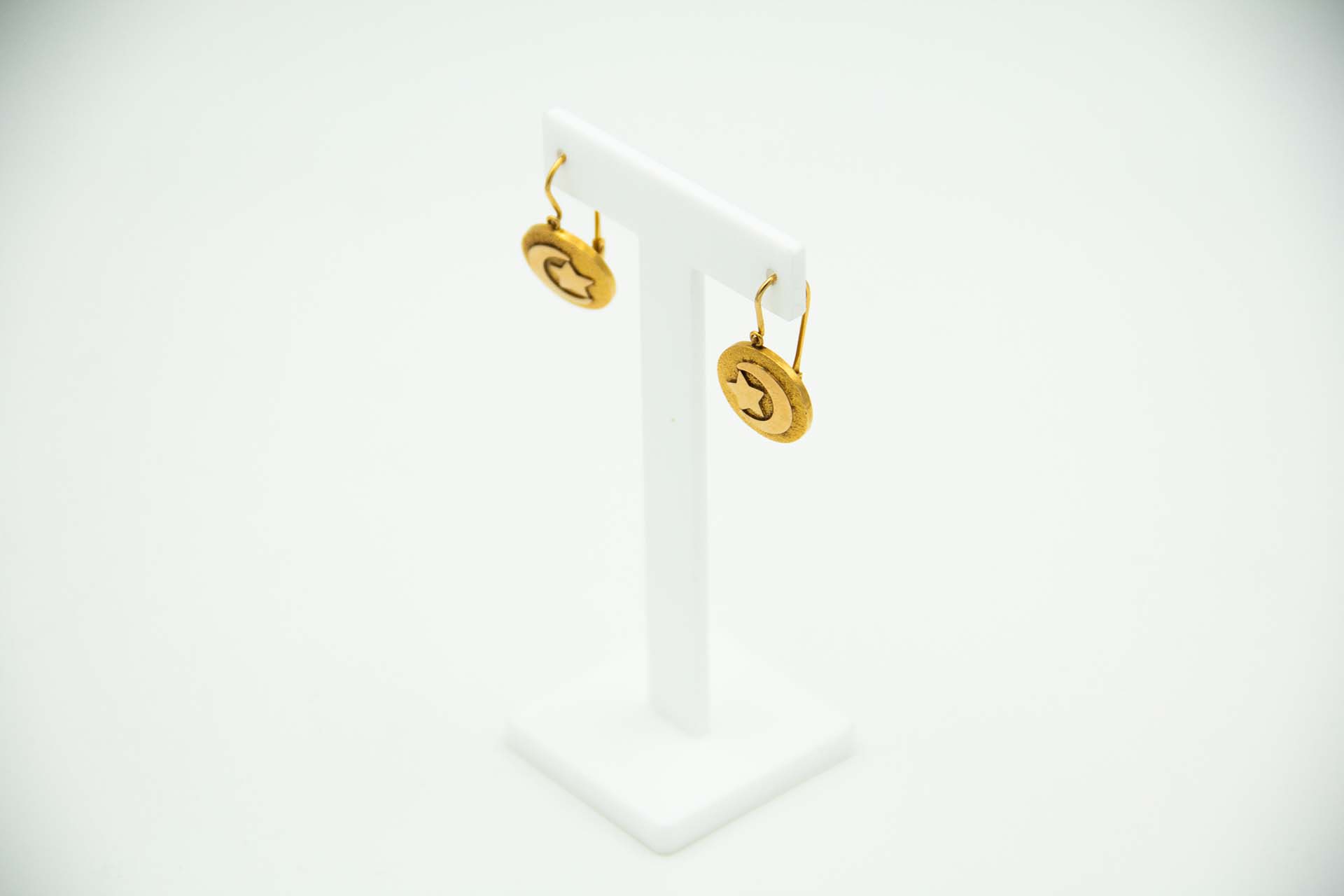 • Descrição: Par de brincos circulares em ouro amarelo com estrelas e meia lua.