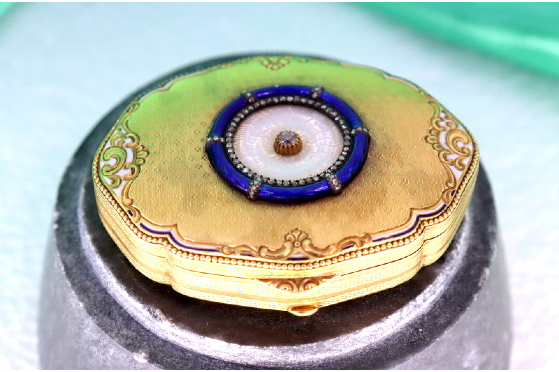 • Descrição: Caixa de comprimidos em ouro guilhochado com diamante em talhe brilhante no centro com esmalte envolvente, lascas de diamantes, friso esmaltado e verso com gravados profusamente definidos.