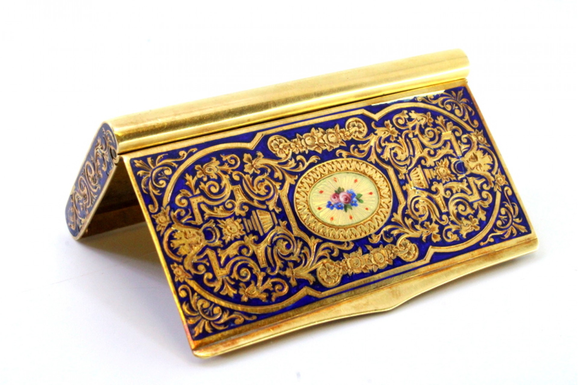 • Descrição: Caixa de rapé em ouro esmaltado com figuras geométricas gravadas, centro com motivos florais sobre tampa basculante.