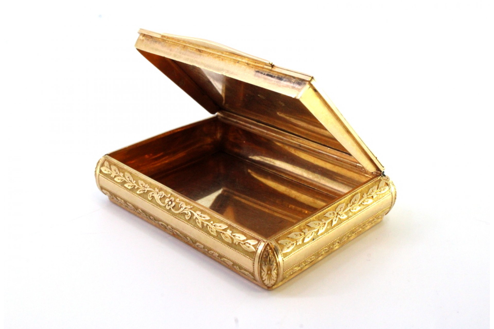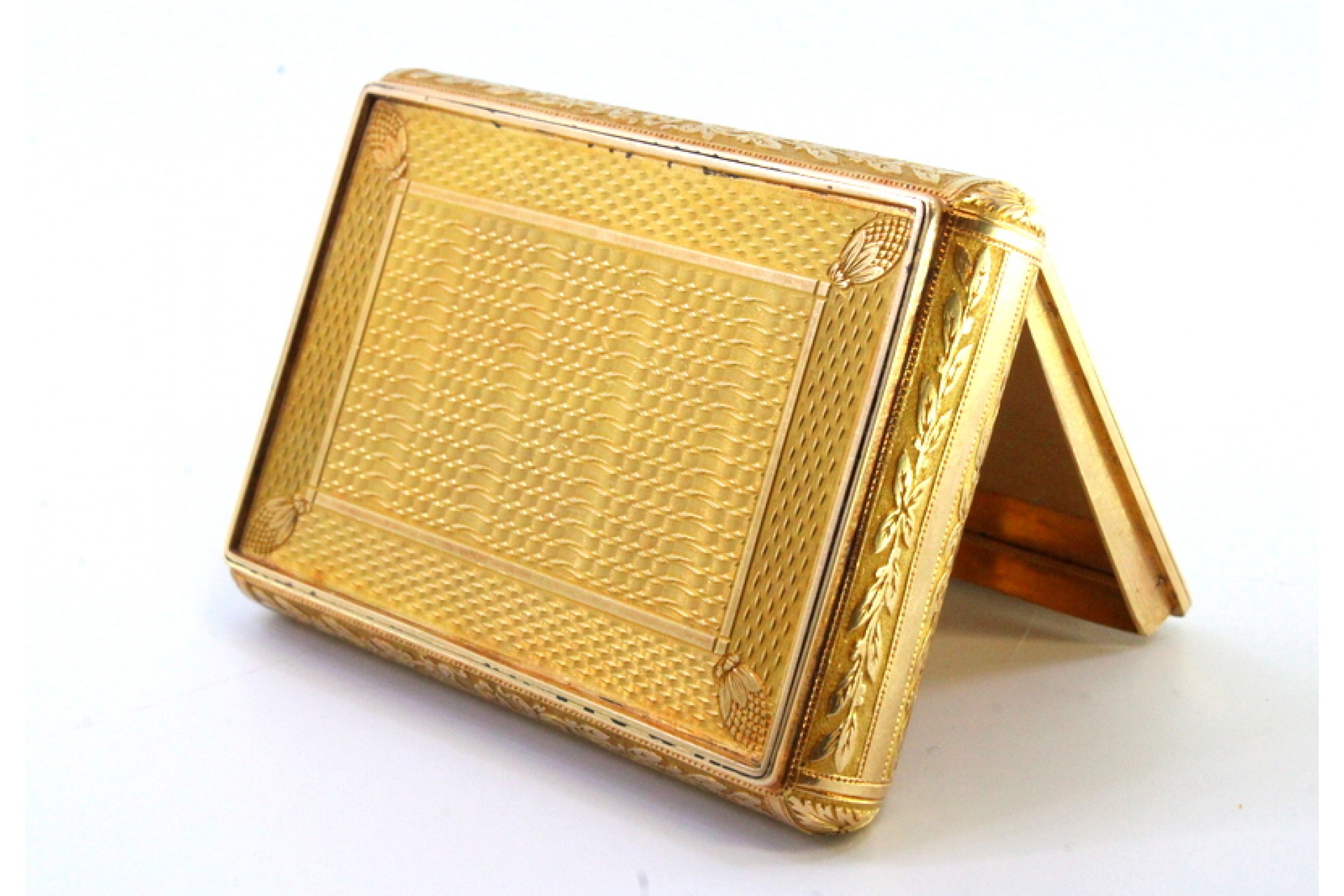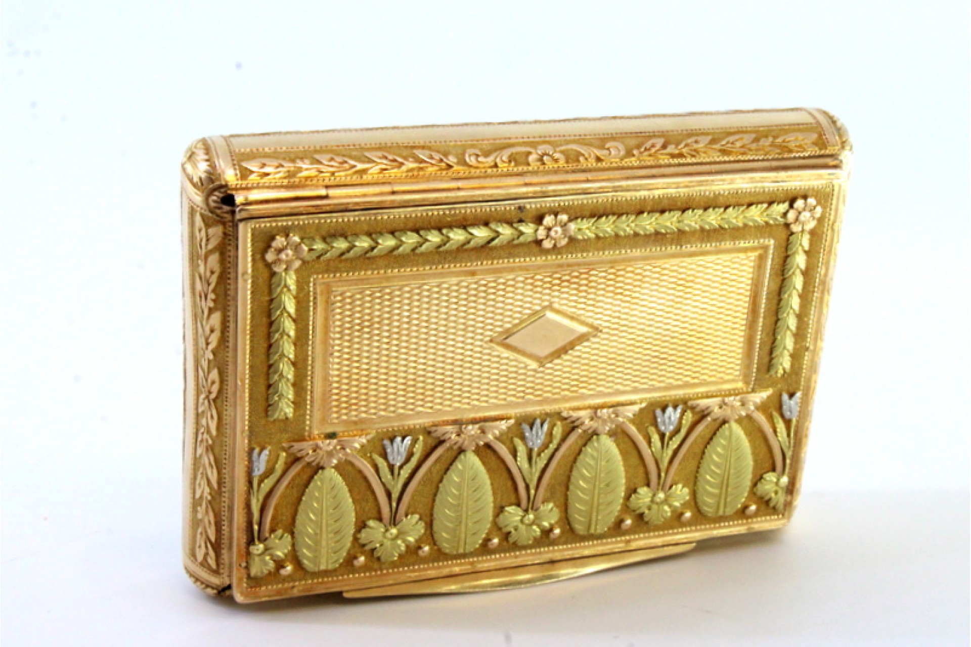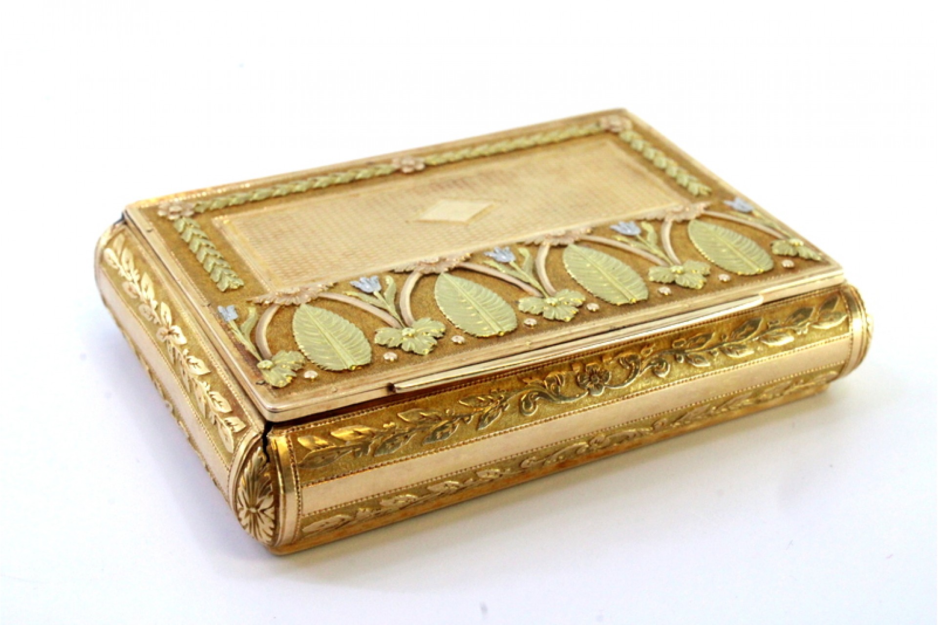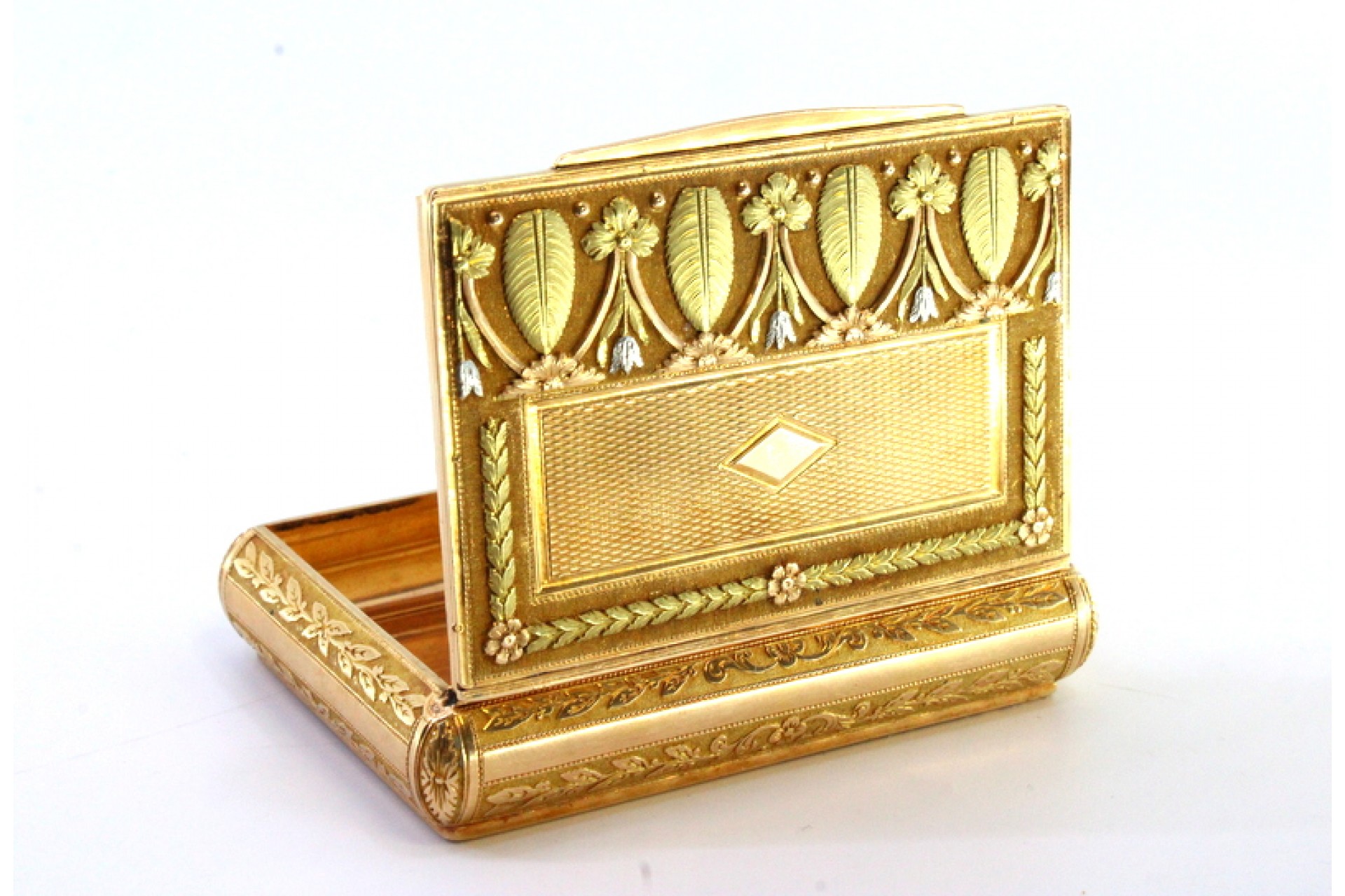 • Descrição: Caixa de rapé em ouro tricolor com palmas, motivos florais, grinaldas ricamente relevadas e cartela para monograma em forma de losangulo sobre a tampa basculante.