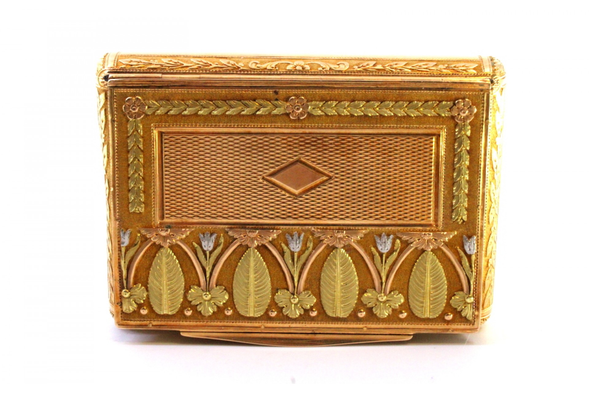 Caixa de rapé em ouro tricolor com palmas, motivos florais e grinaldas