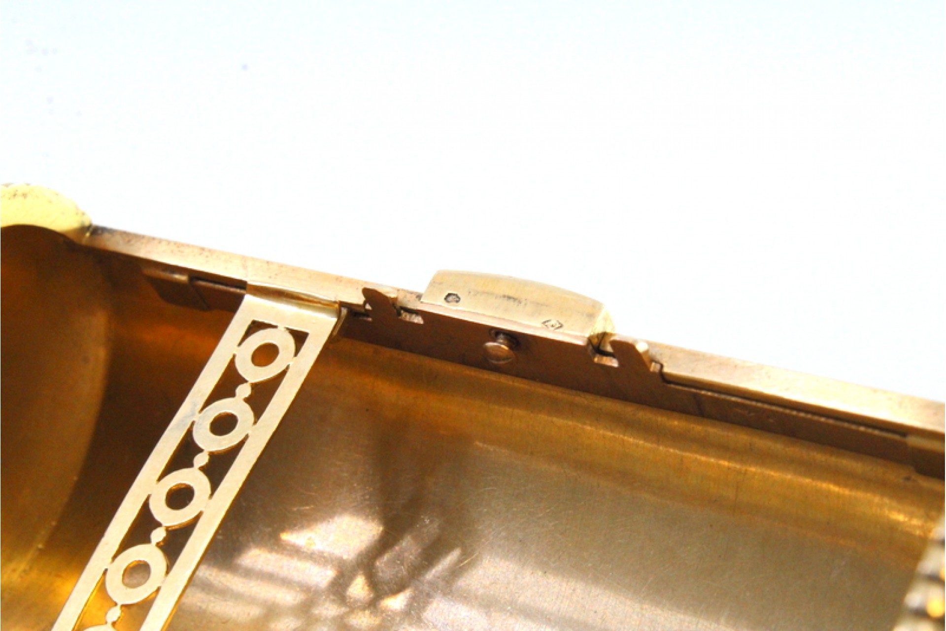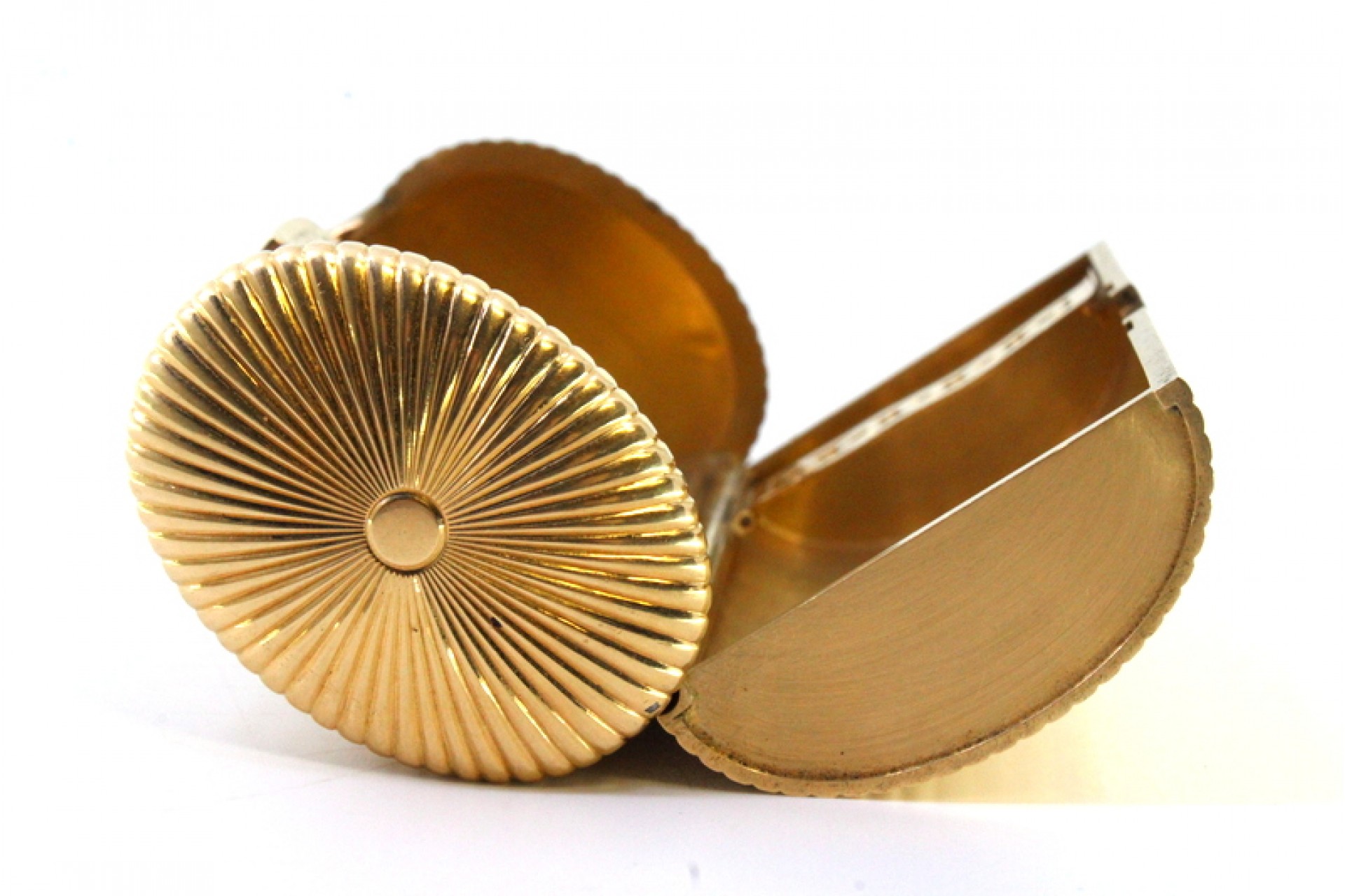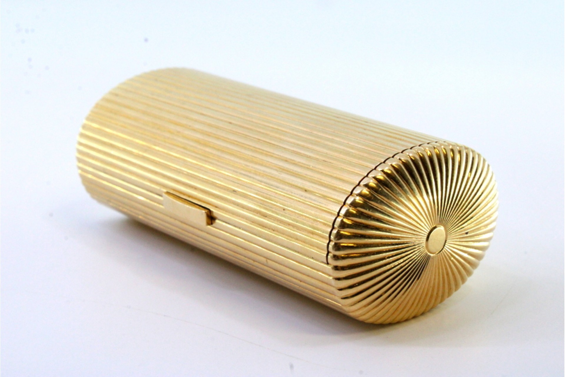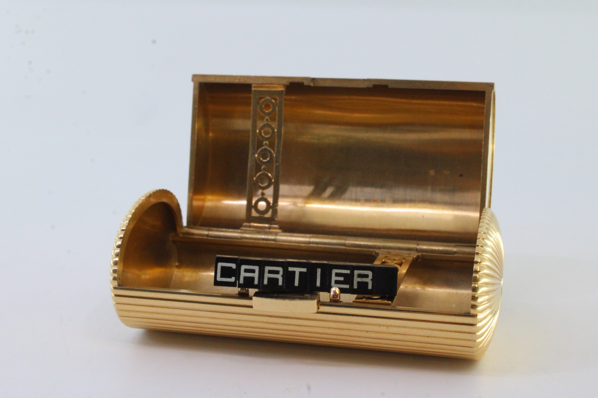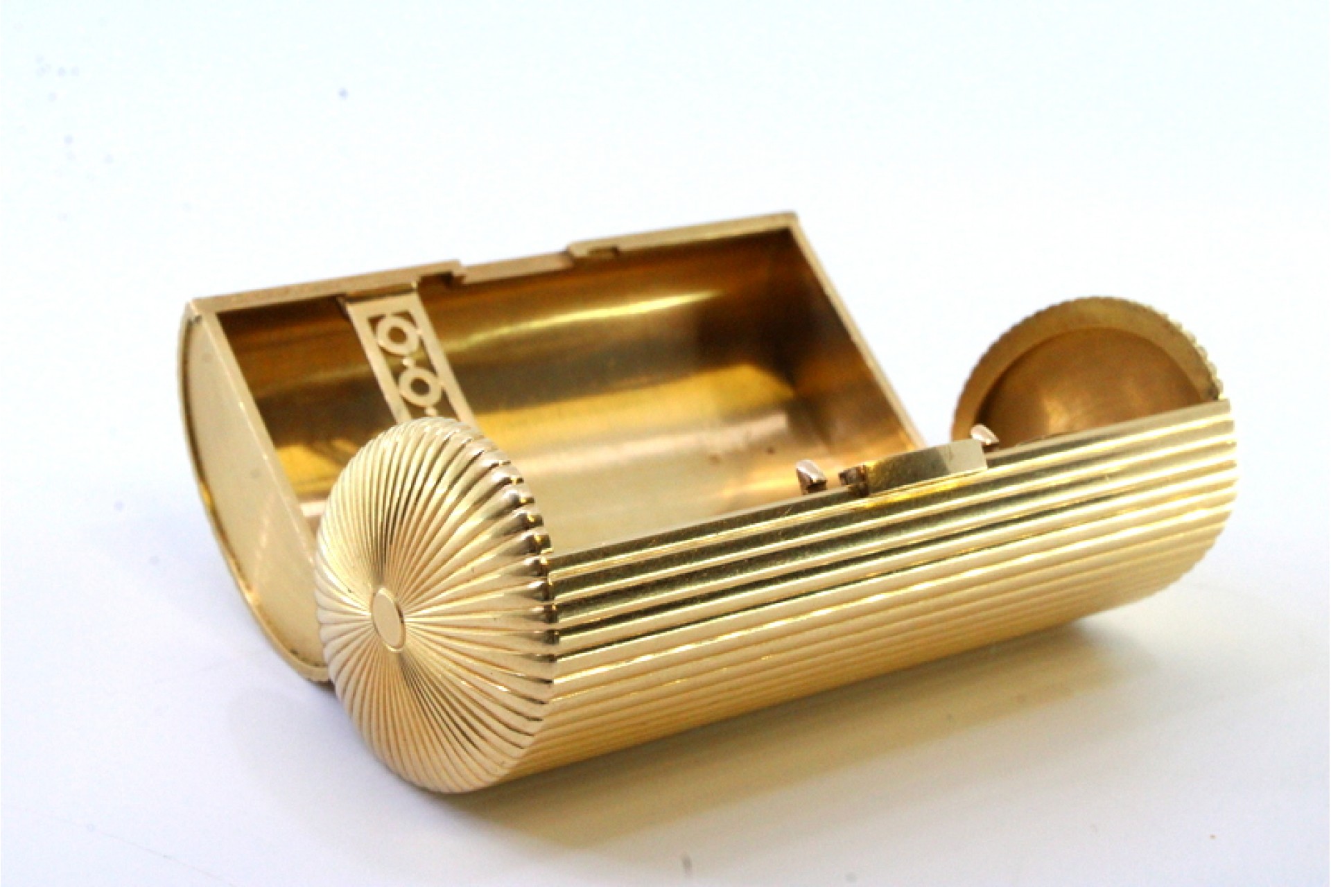 • Descrição: Caixade toilette em ouro canelado com tampa basculante de pressão e interior com duas divisórias recortadas, marca CARTIER.