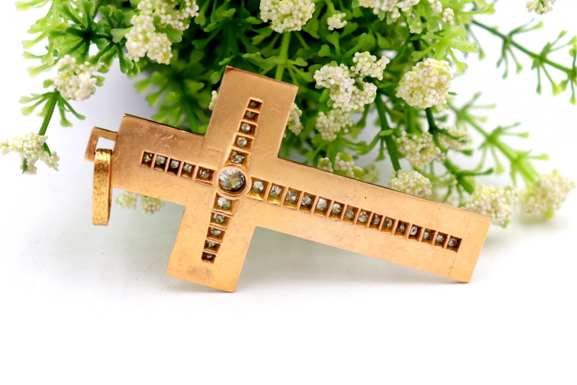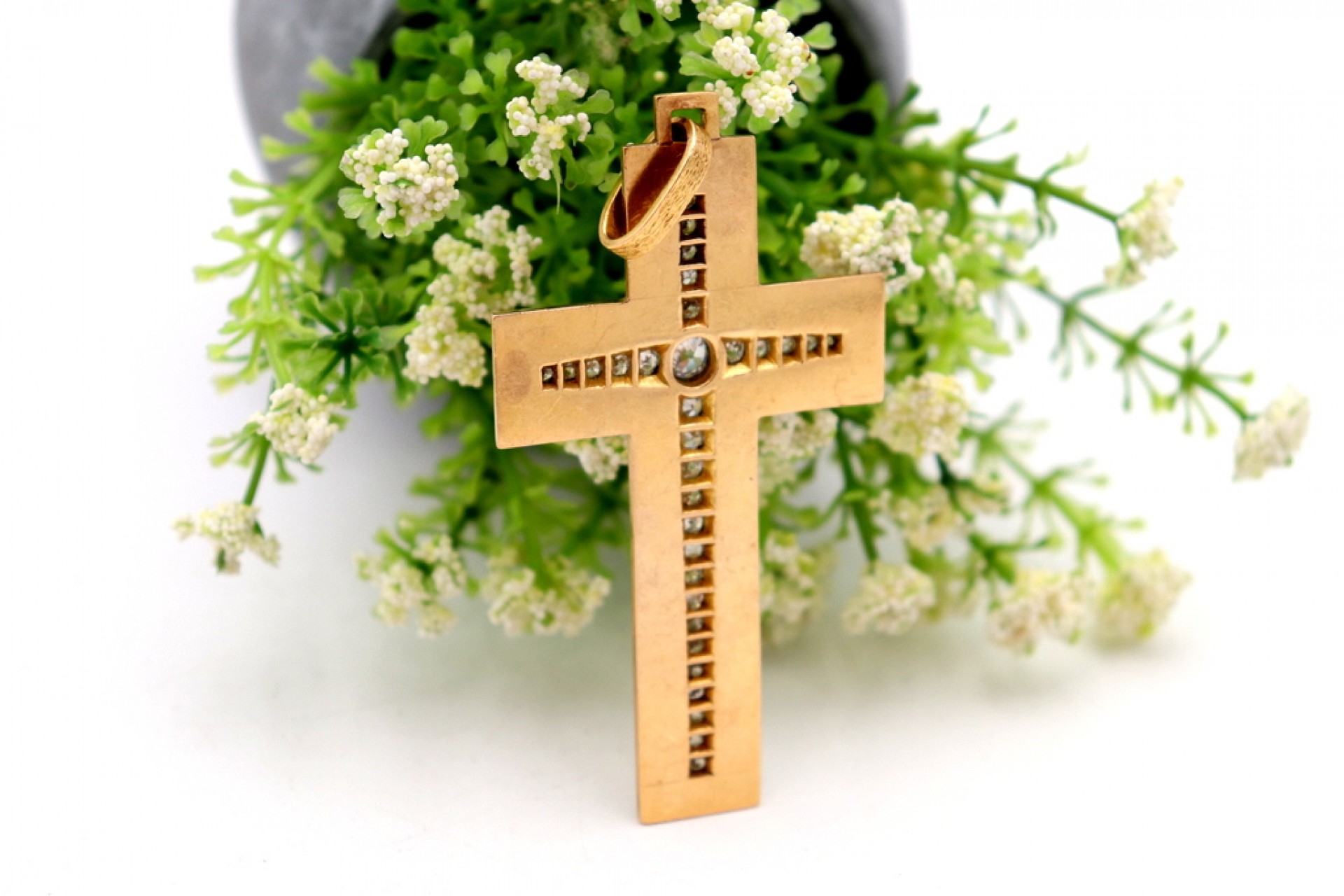 • Descrição: Cruz em ouro escovado com diamantes (31) em talhe rosa e argola de suspensão.