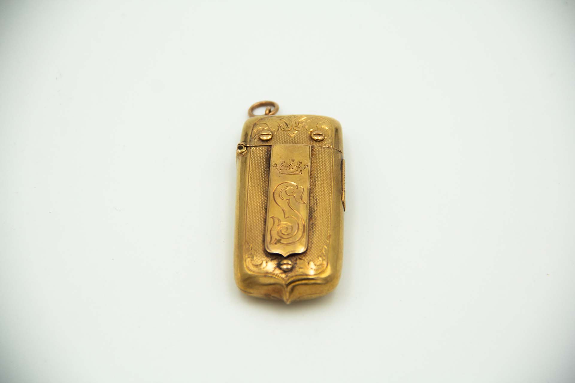 • Descrição: Fosforeira de forma retangular em ouro com gravados guilhochados.