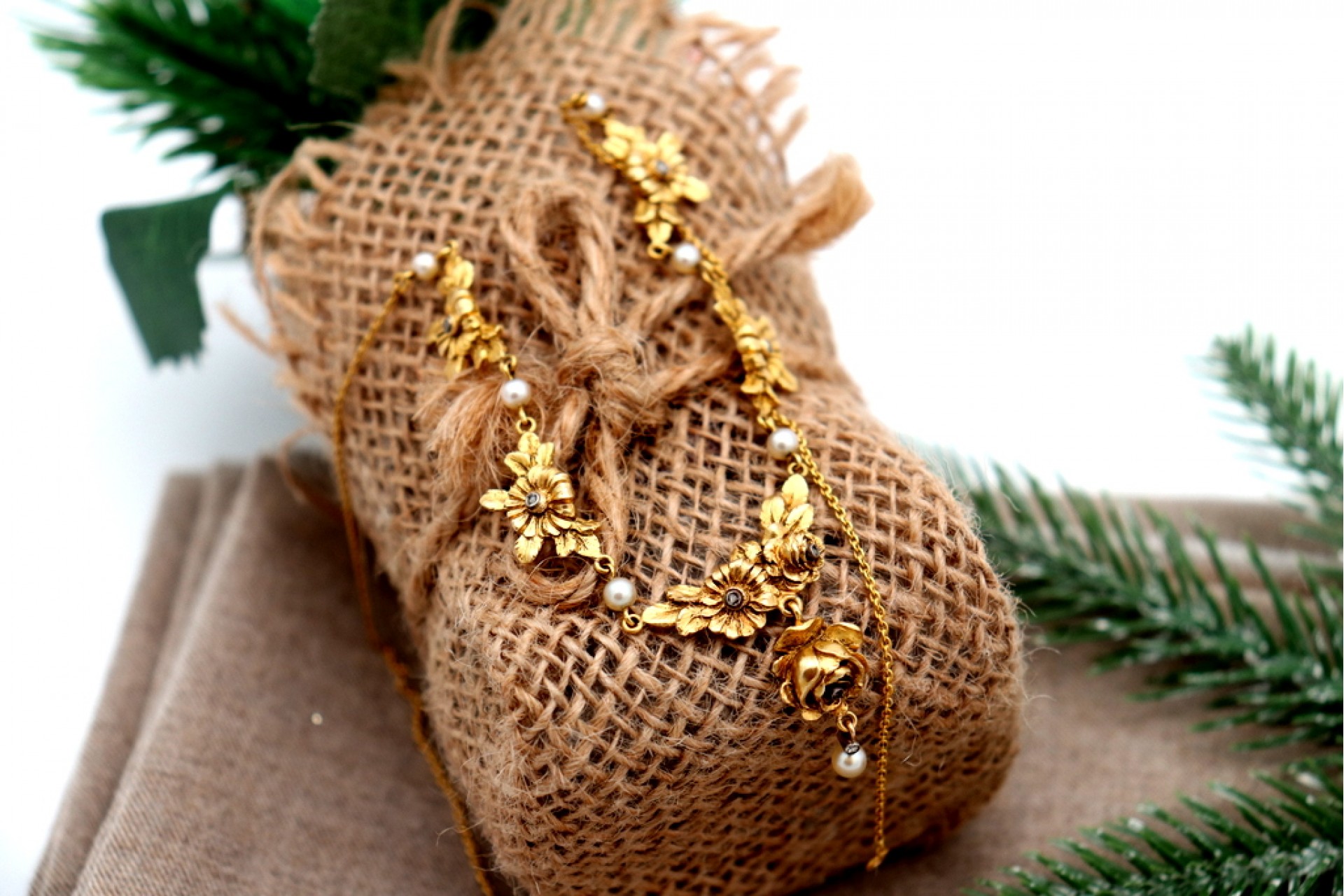 Colar em ouro com relevos em forma de flores, aplicações de lascas de diamante