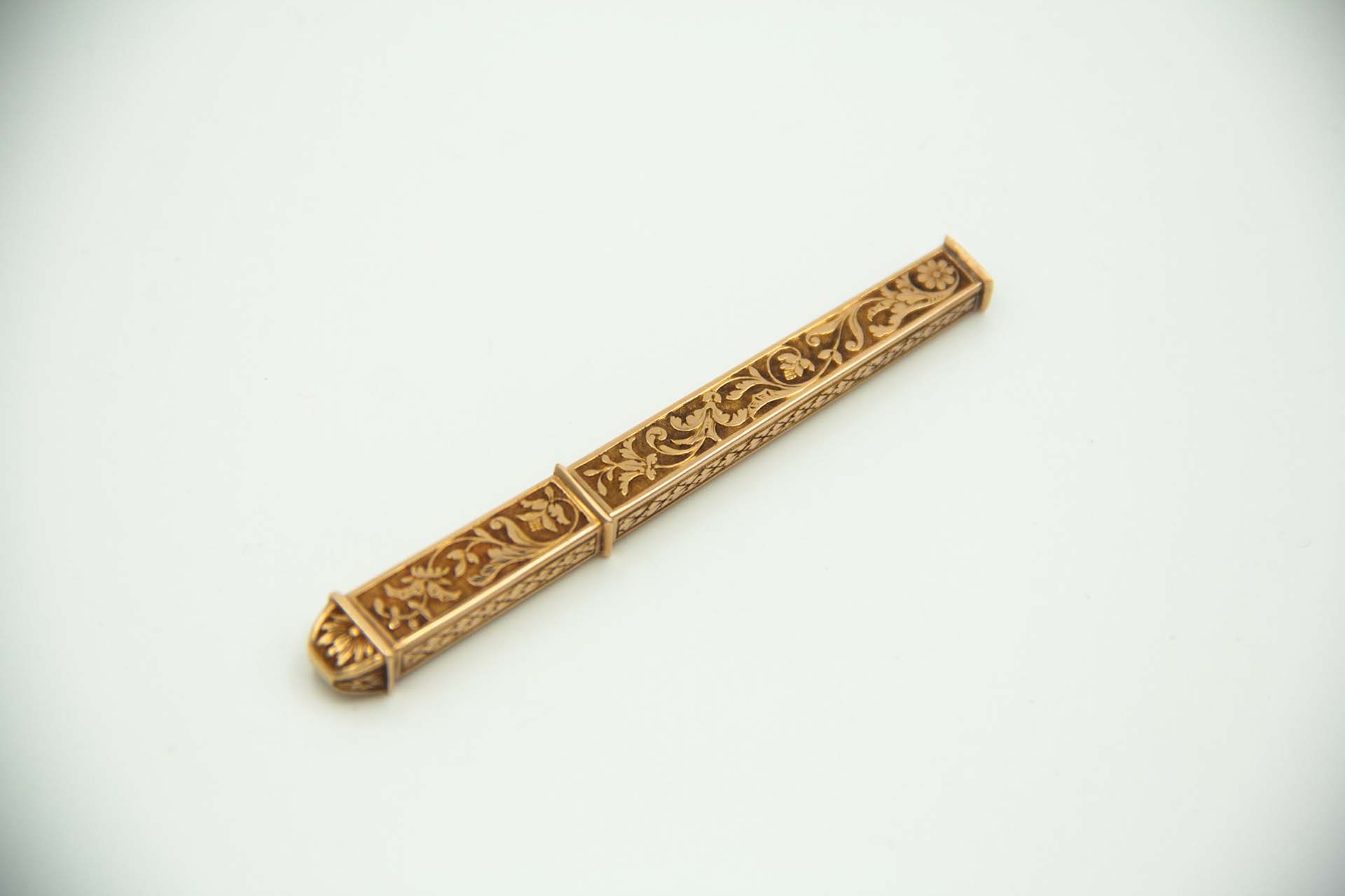 Lapiseira em ouro amarelo com bandas guilhochadas ao alto.