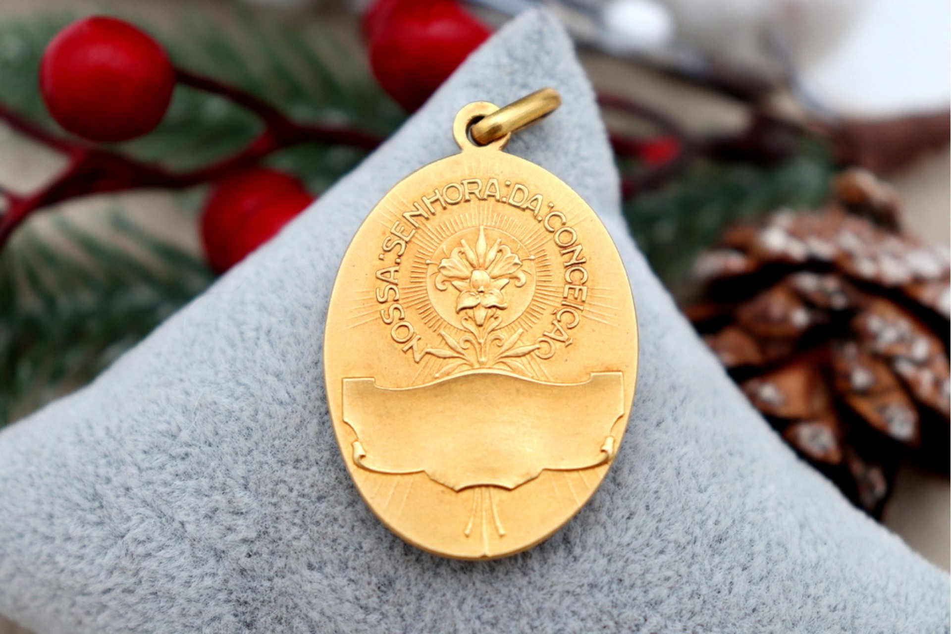 • Descrição: Medalha em ouro em forma oval com Nossa Senhora da Conceição em vulto perfeito revelado e argola de suspensão