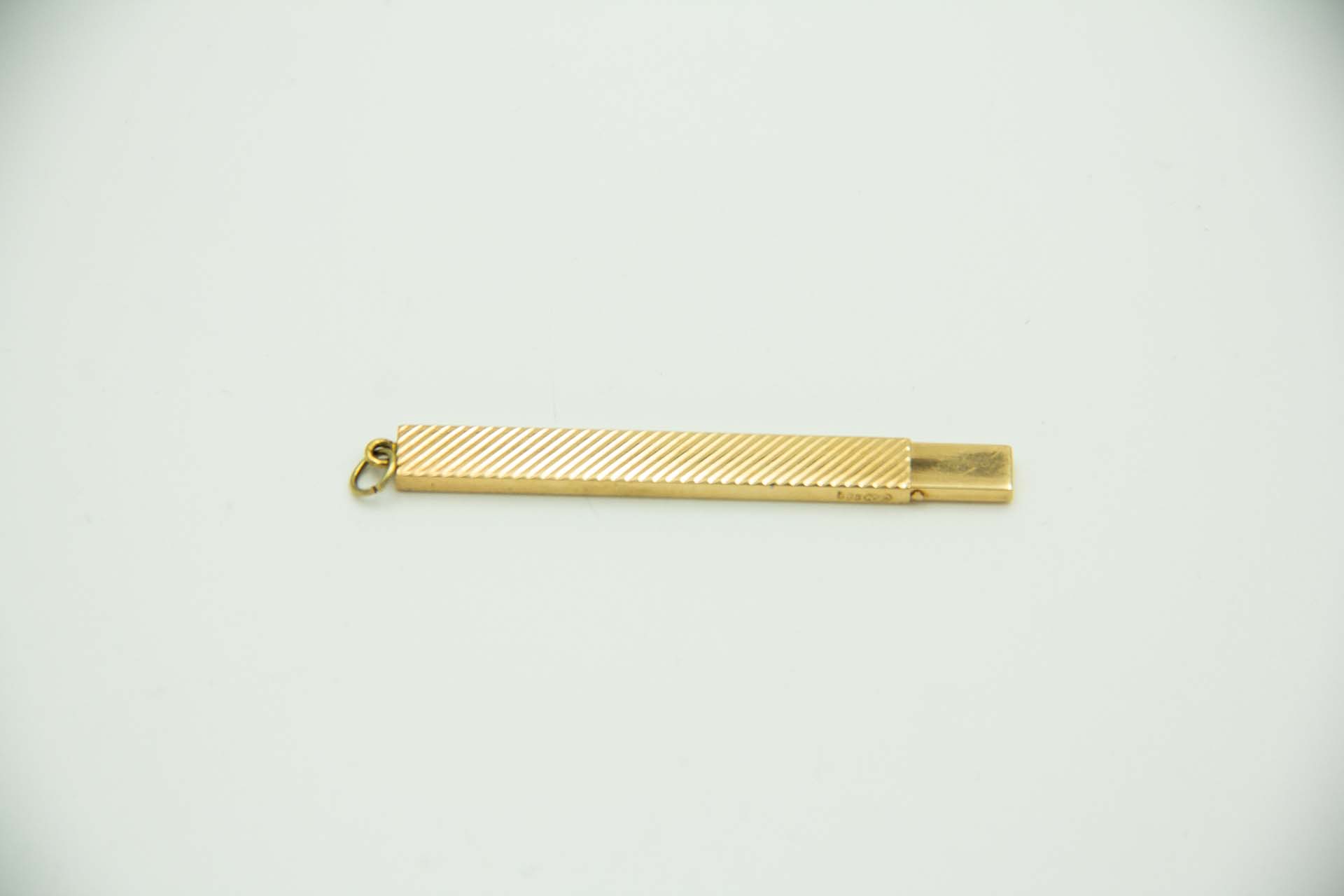 Palito em ouro amarelo com relevos e argola de suspensão.