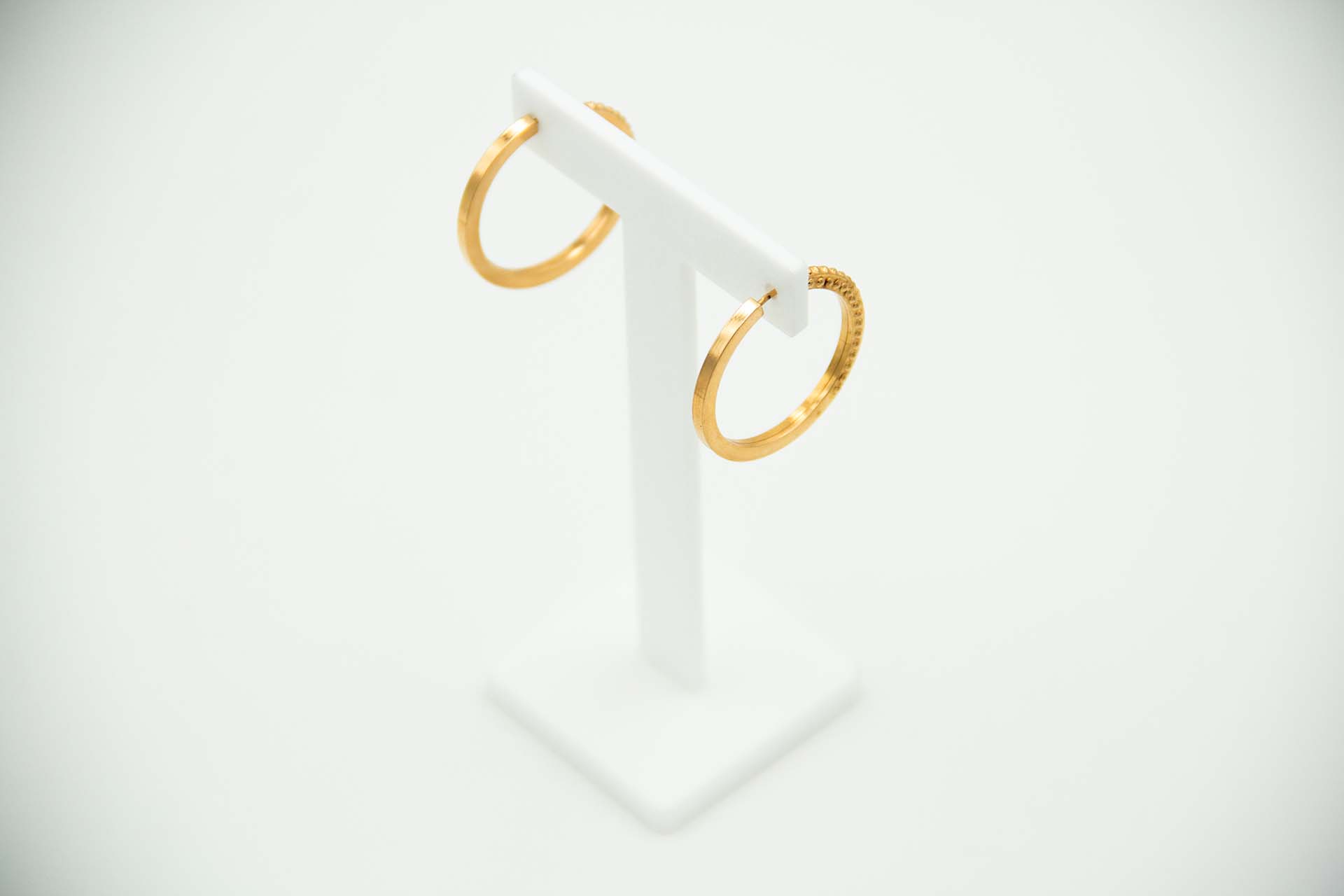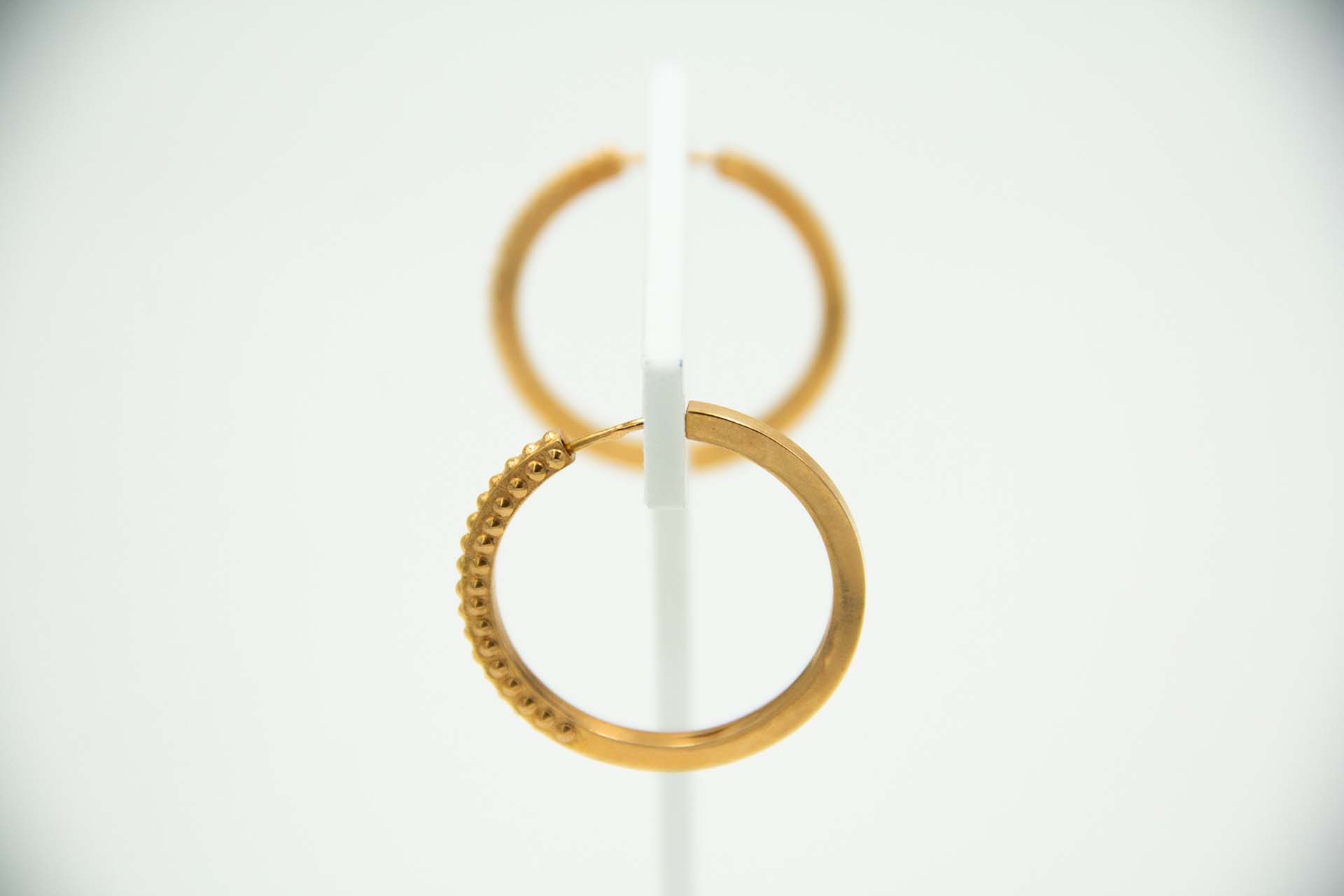 • Descrição: Par de argolas circulares em ouro amarelo com relevos