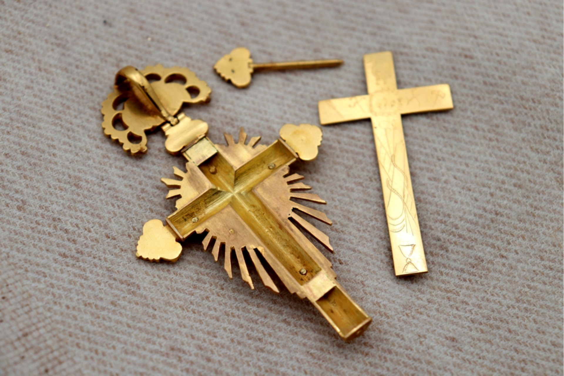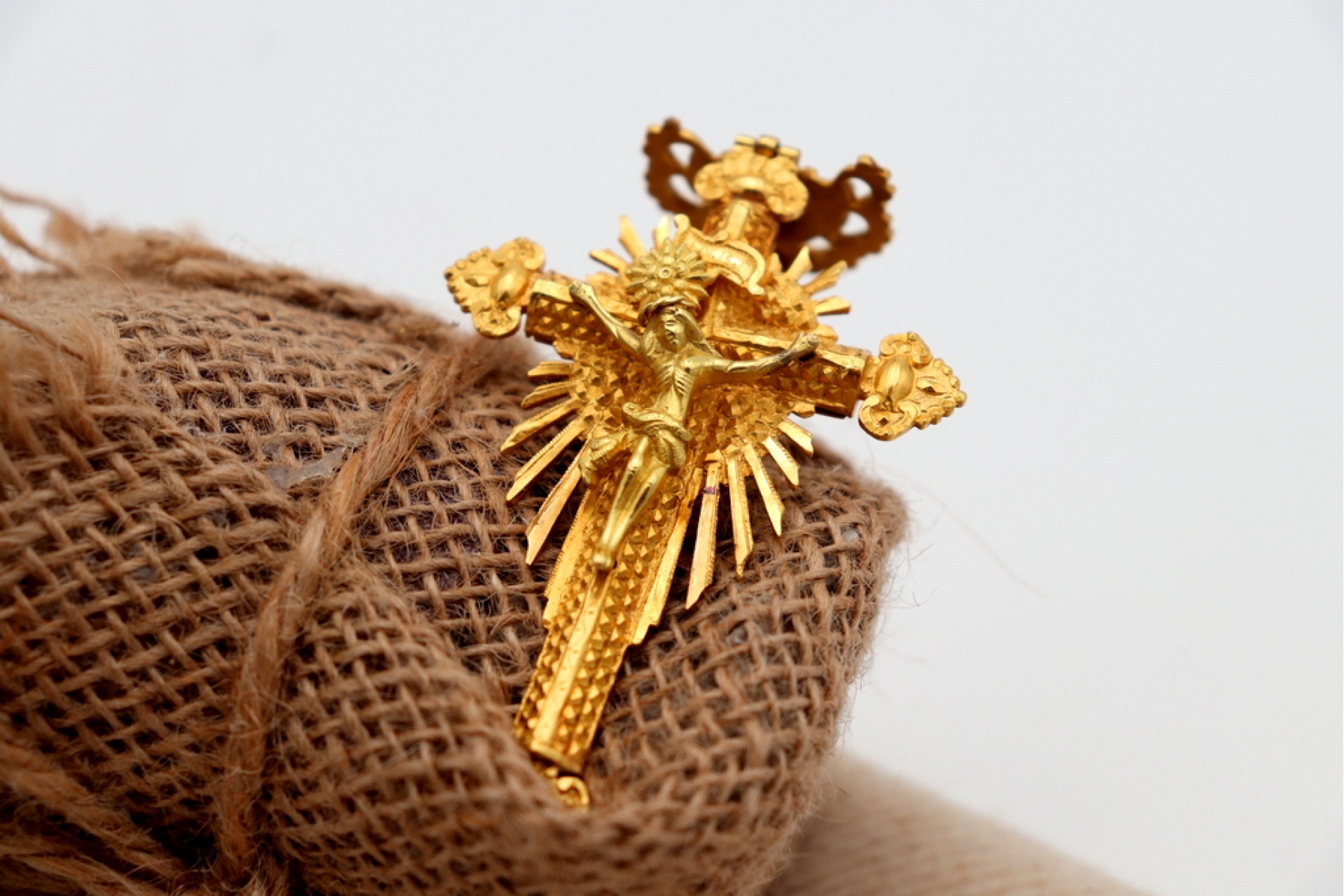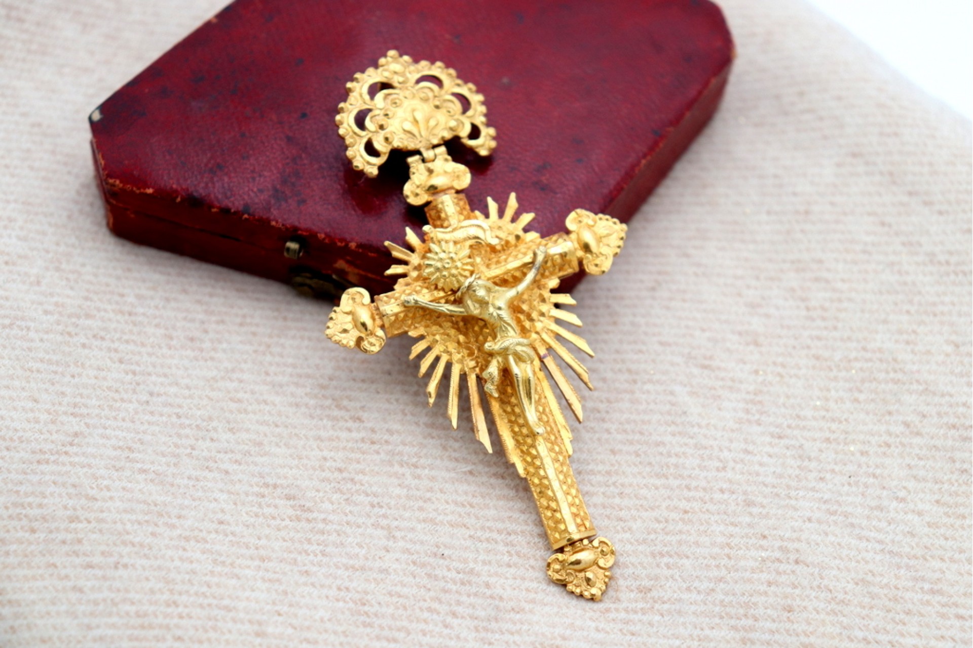 • Descrição: Crucifixo/relicário em ouro com resplendor e cristo em vulto perfeito, recortes e relevos, reverso com simbolos religiosos.