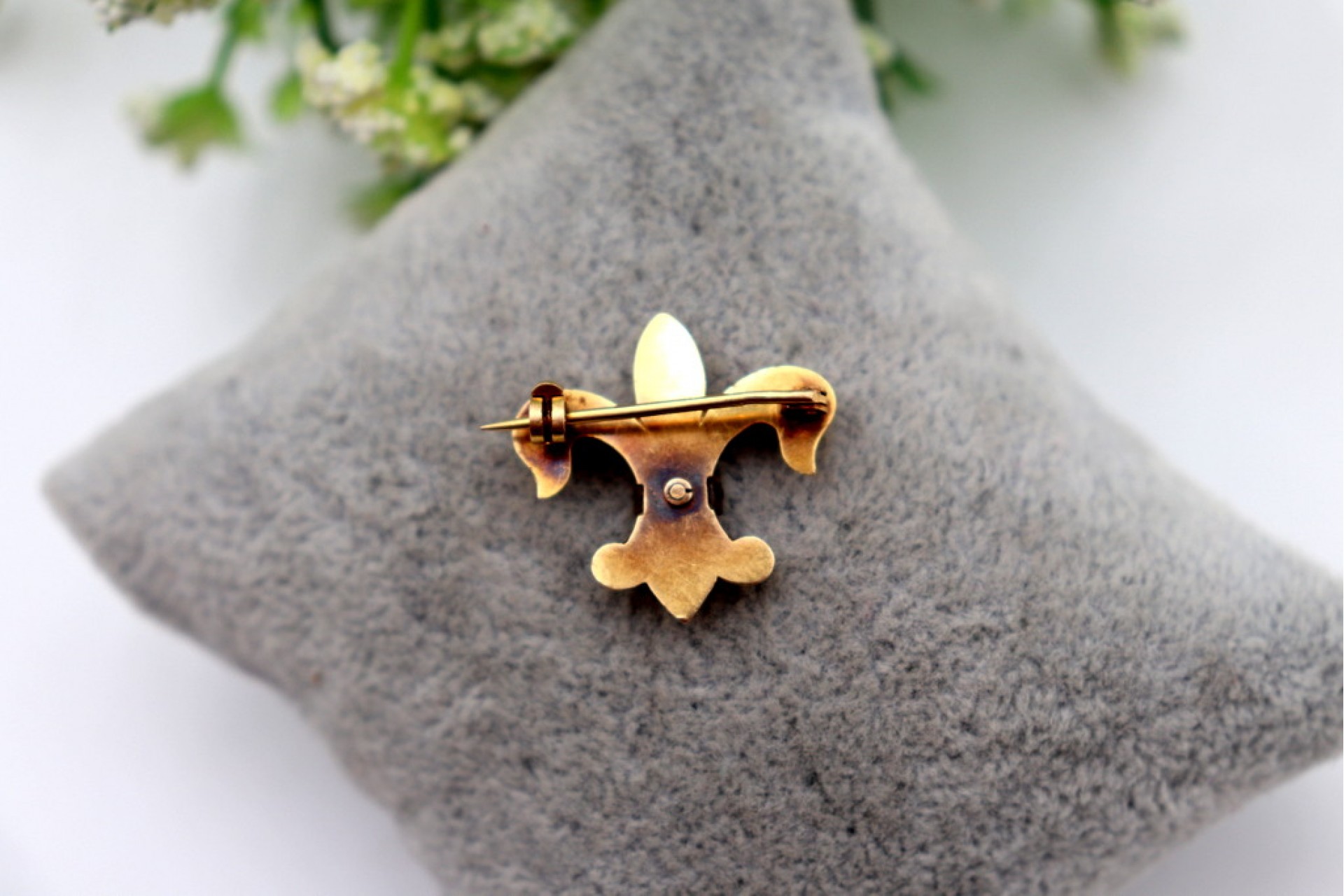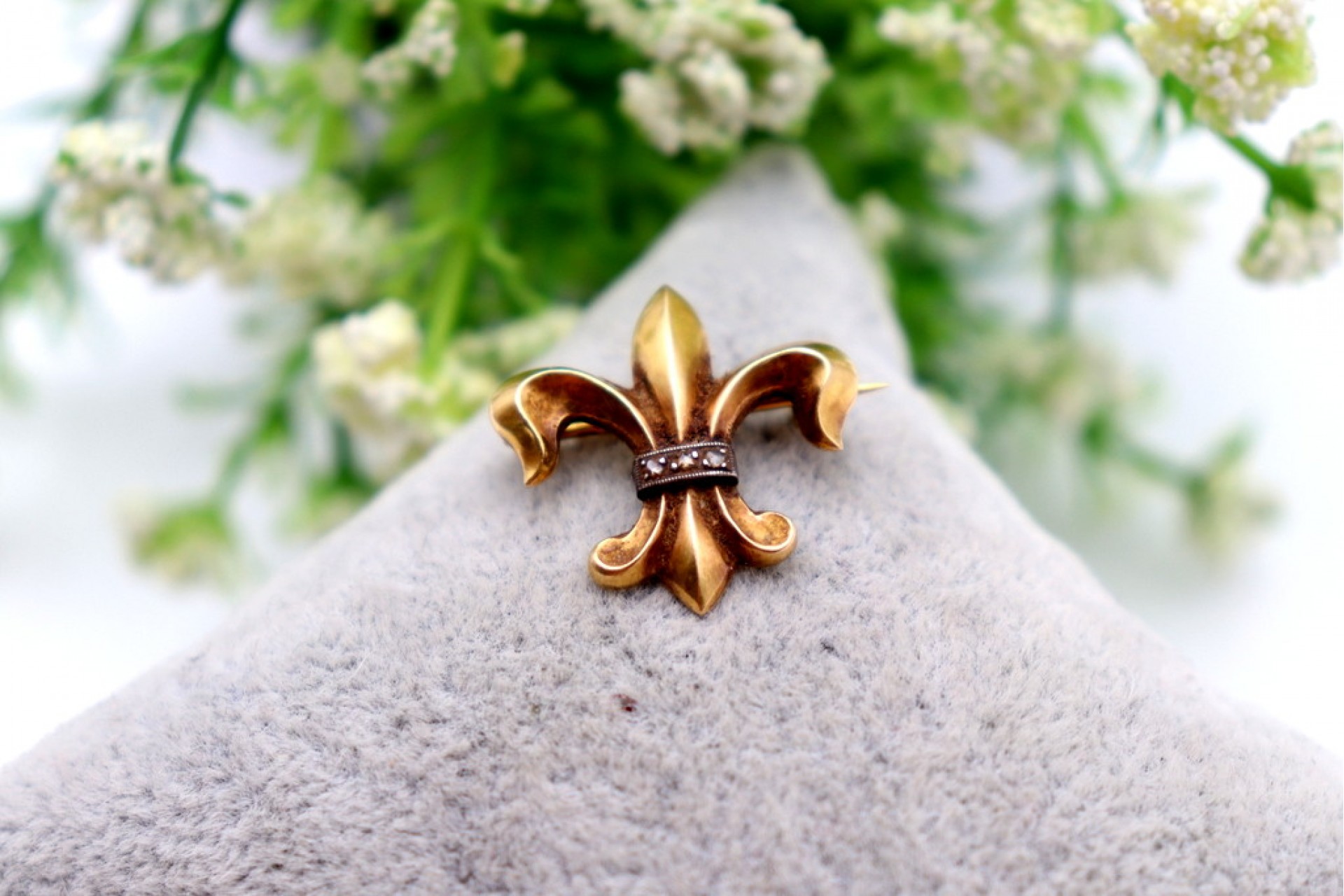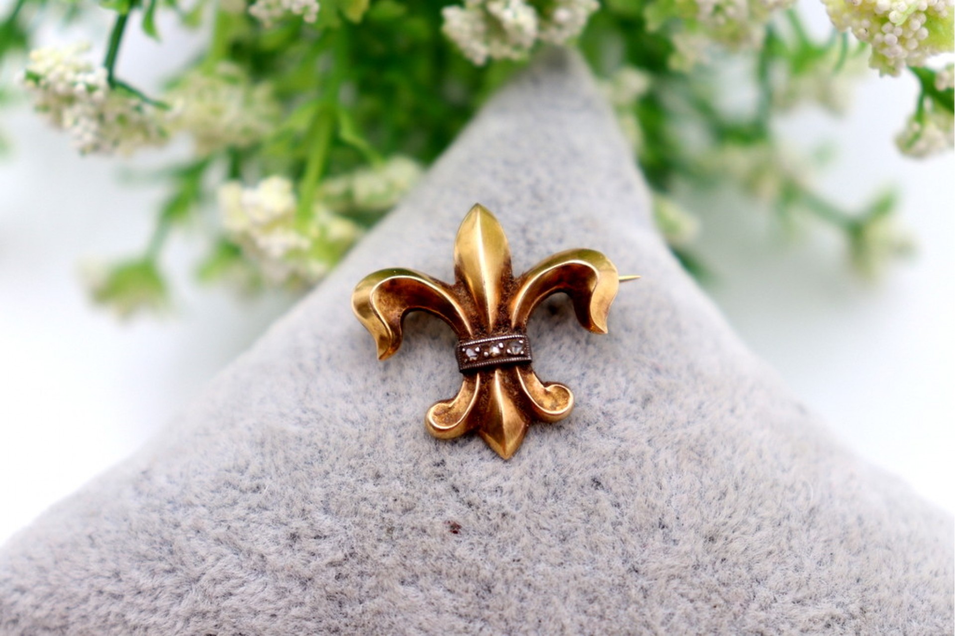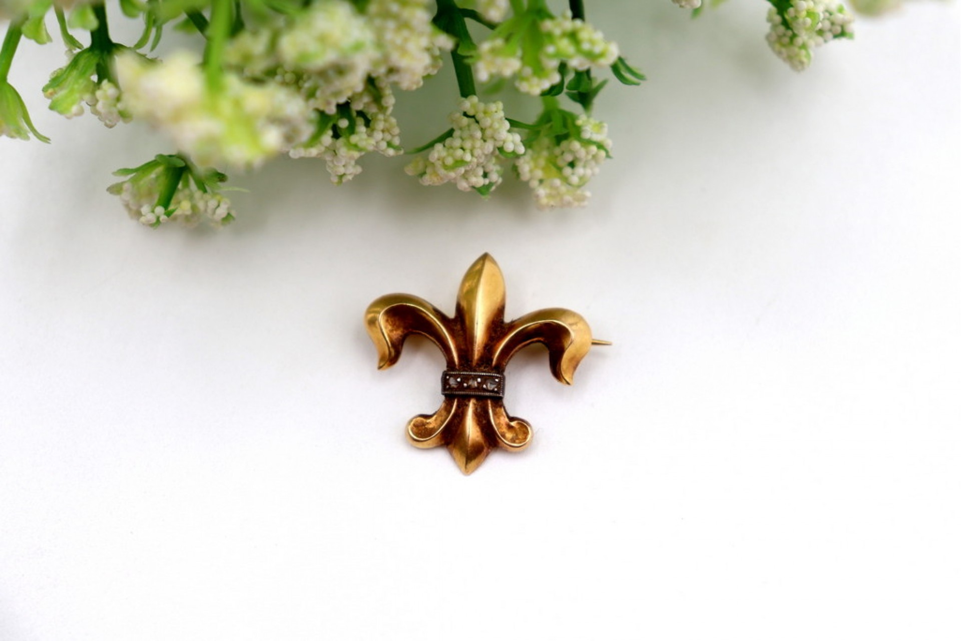• Descrição: Pregadeira em ouro em forma de flor de lis com lascas de diamantes aplicadas em prata.