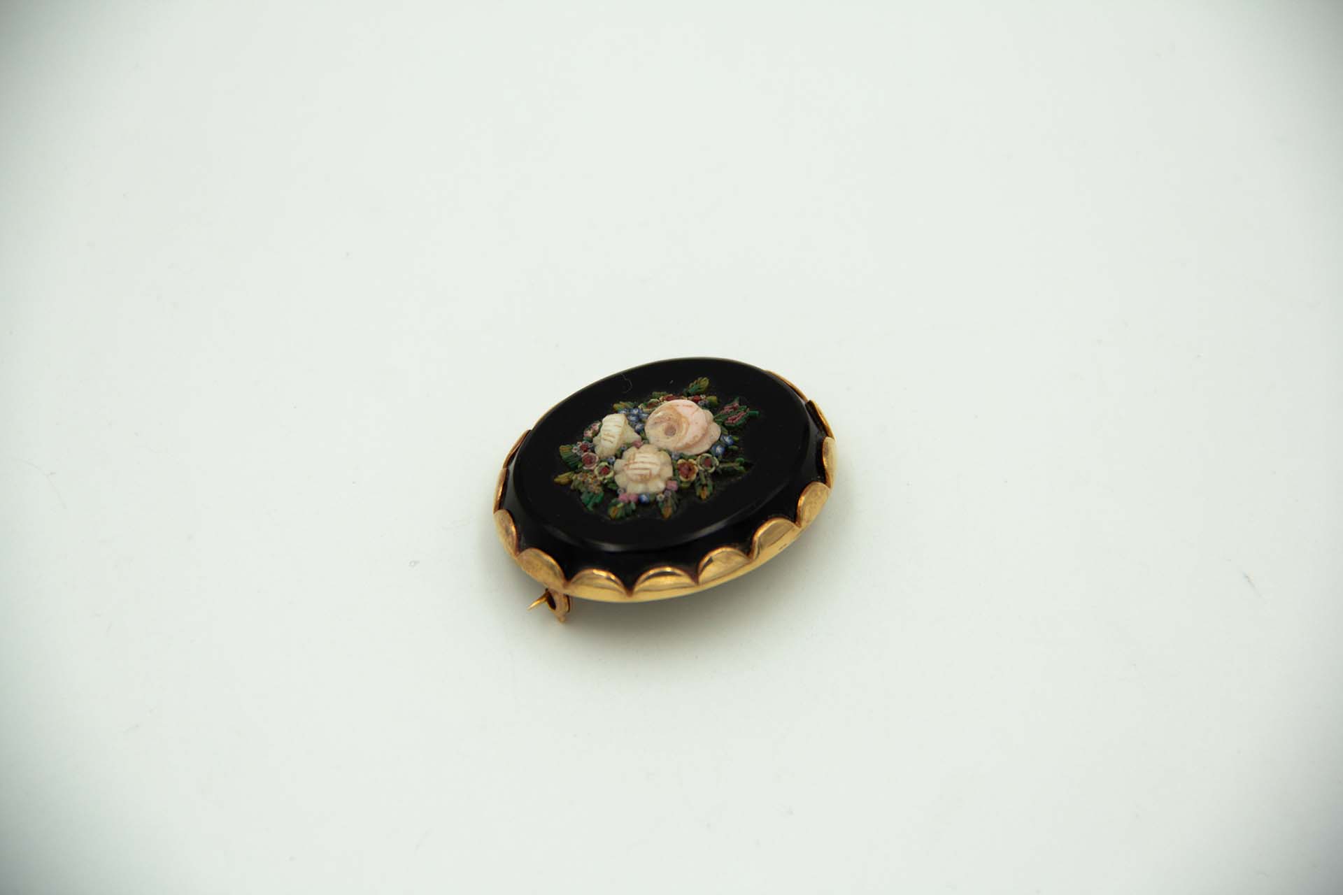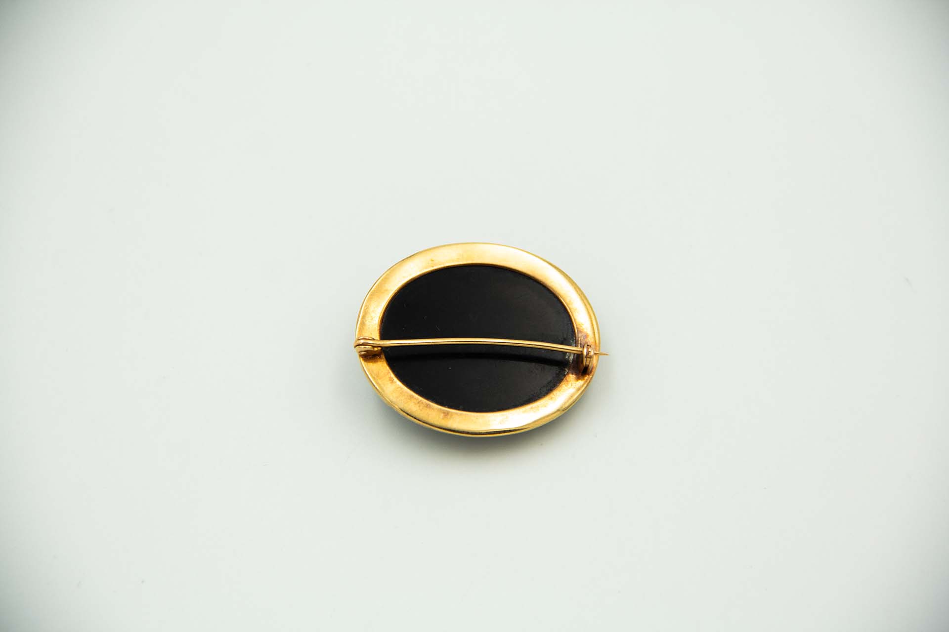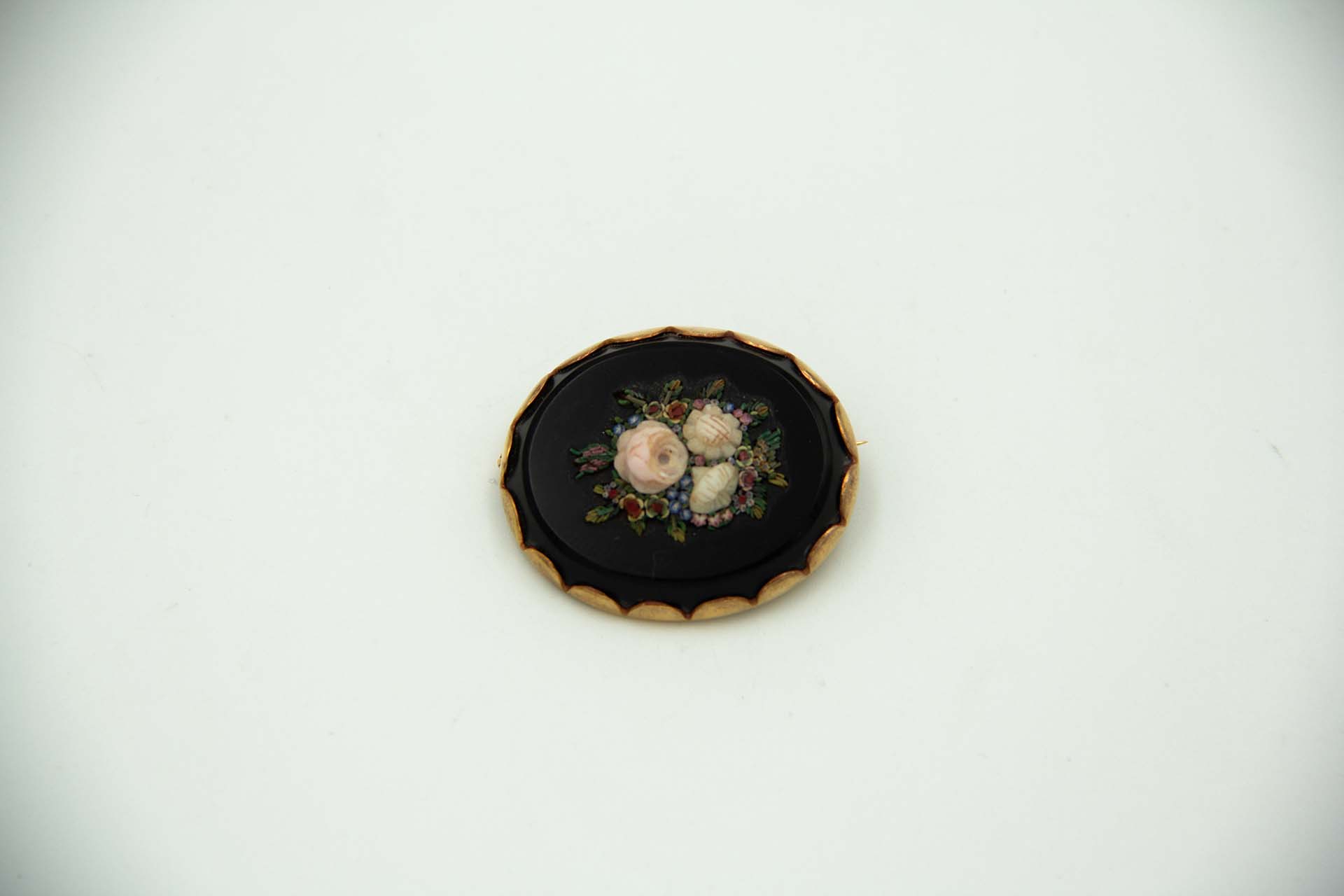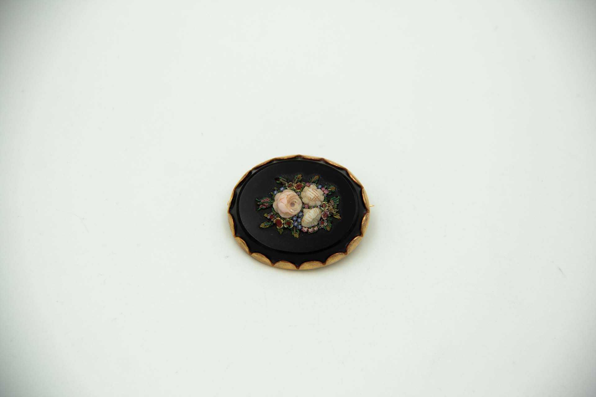 • Descrição: Pregadeira oval com aro em ouro recortado envolvendo onix com rosas relevadas.
