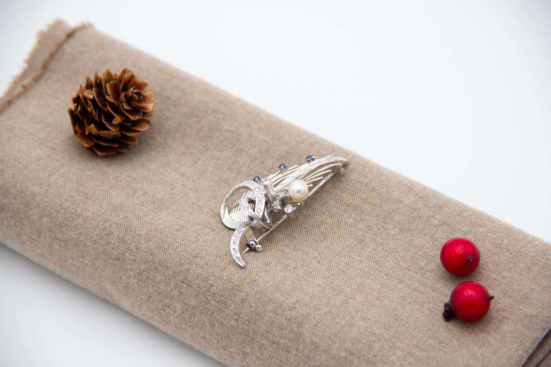 Alfinete de ouro branco com diamantes em talhe brilhante 8/8, safiras calibradas, pérola de cultura e brilhante central 0.10ct.