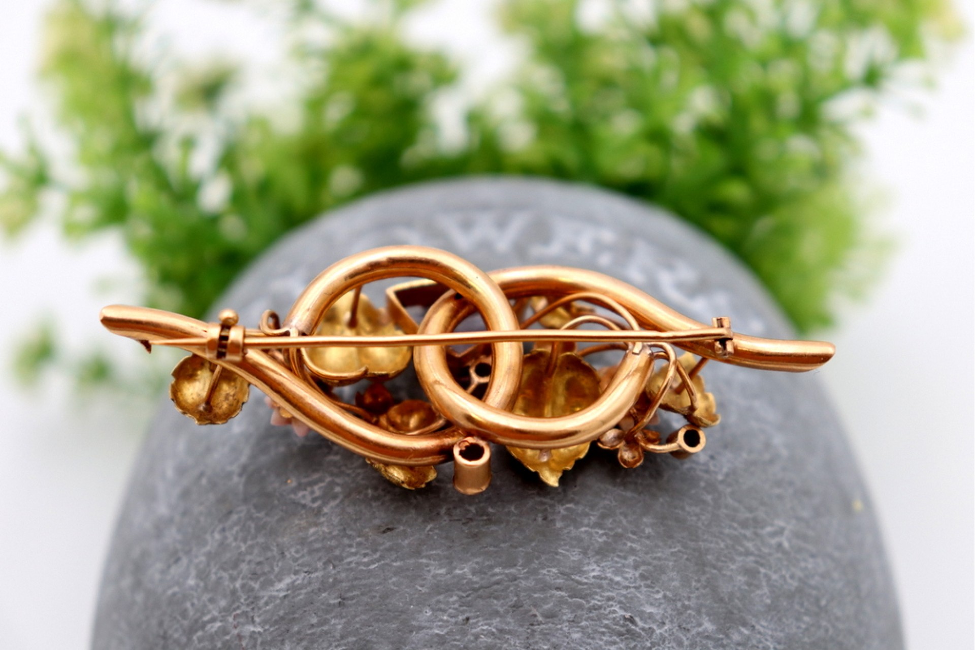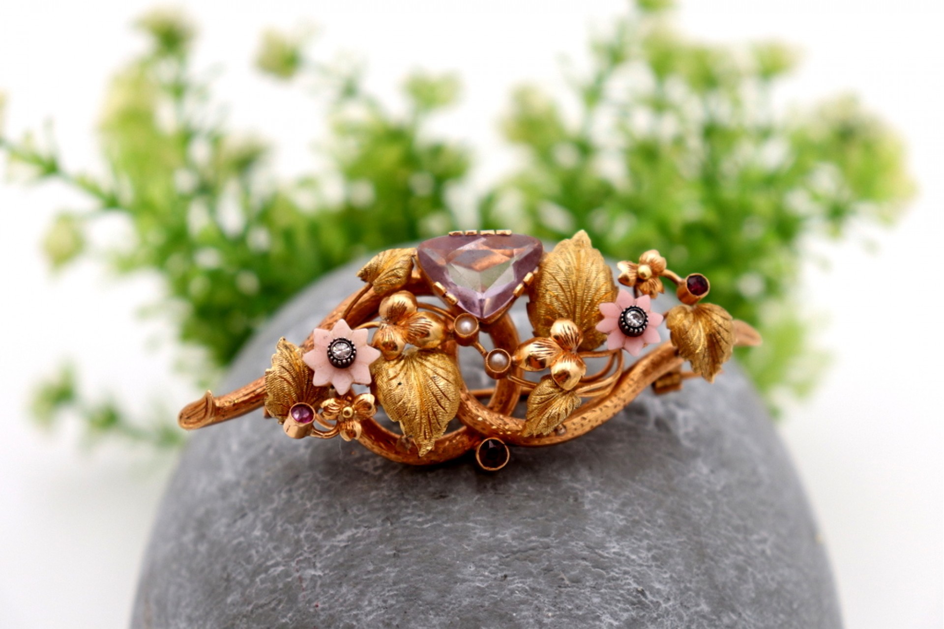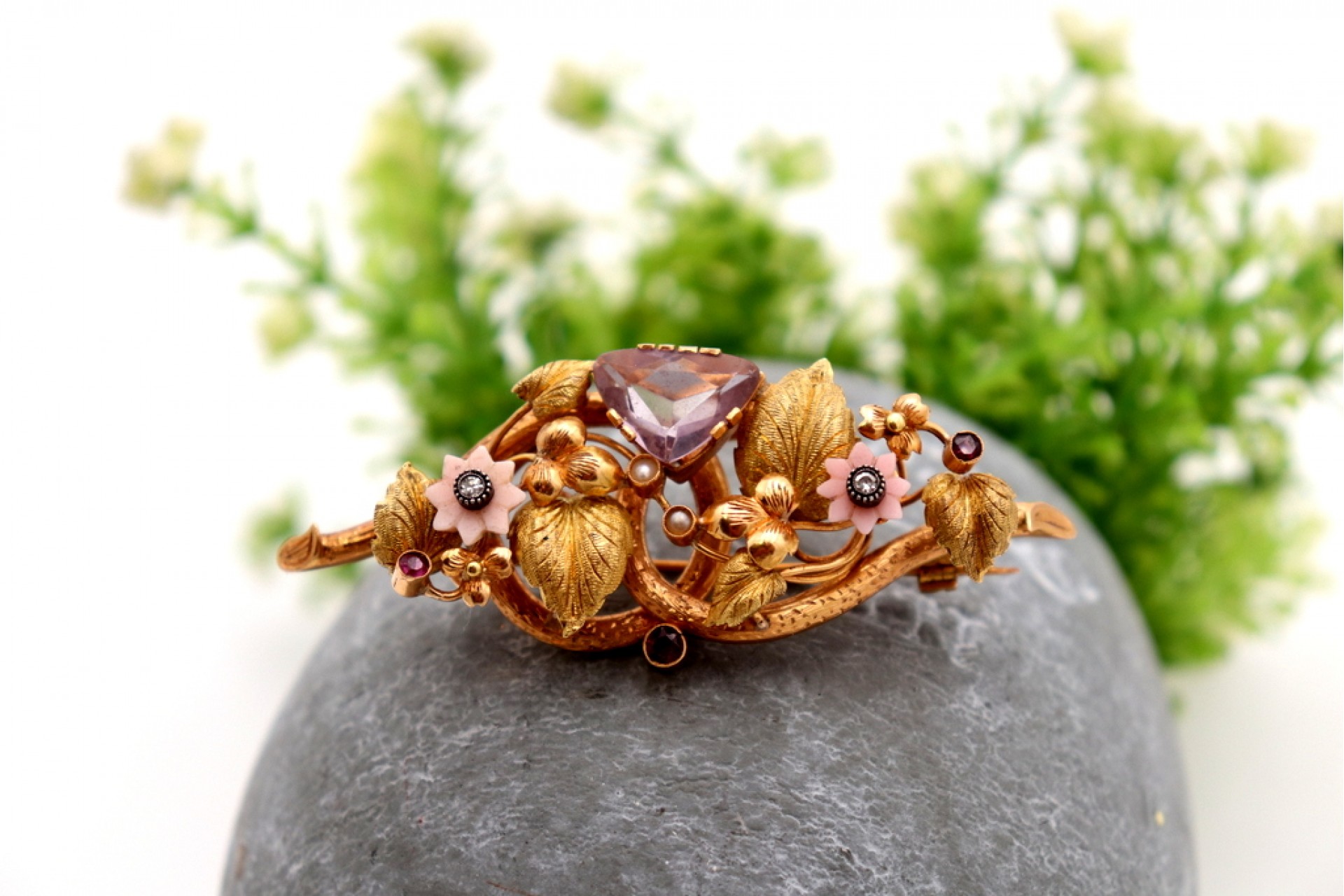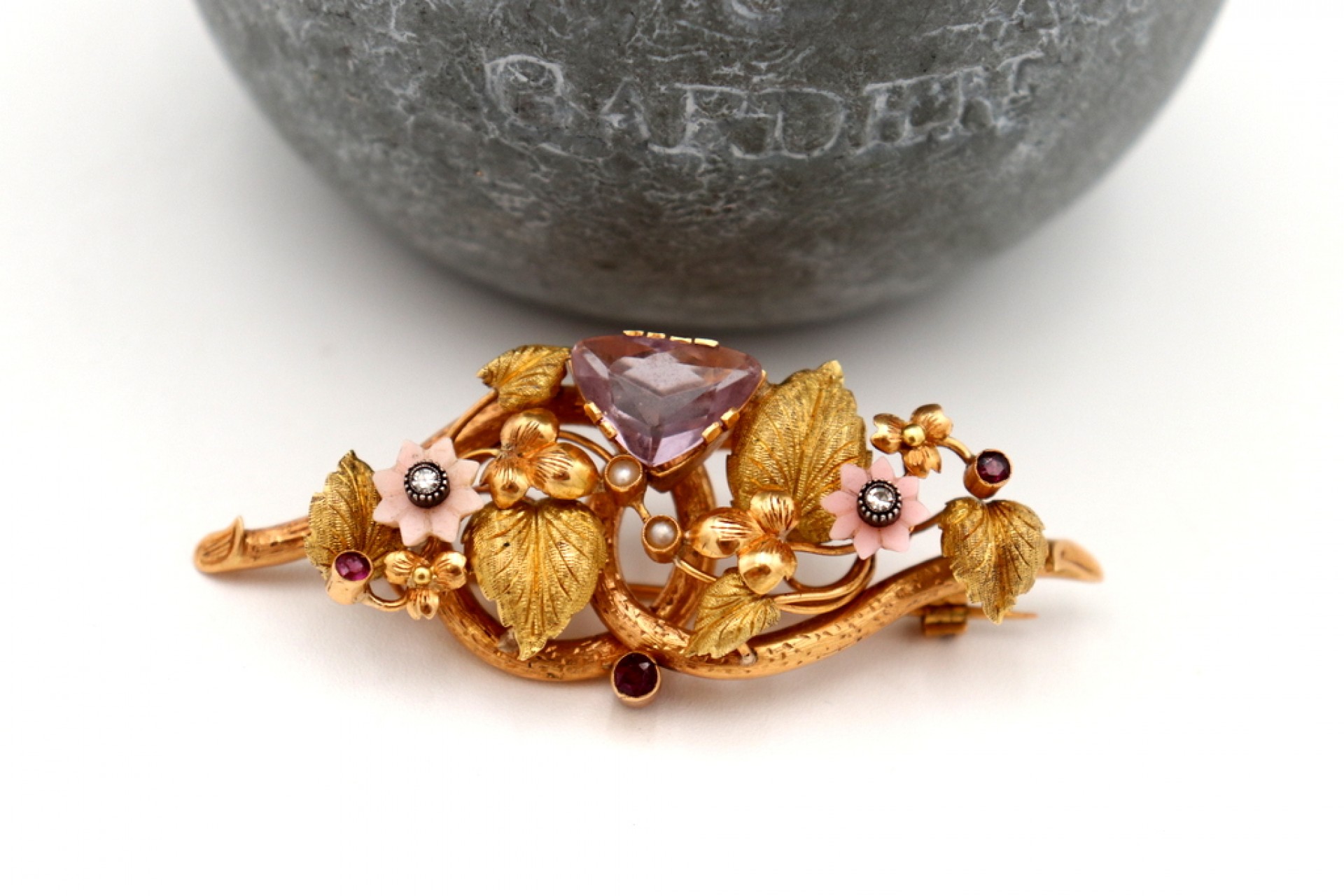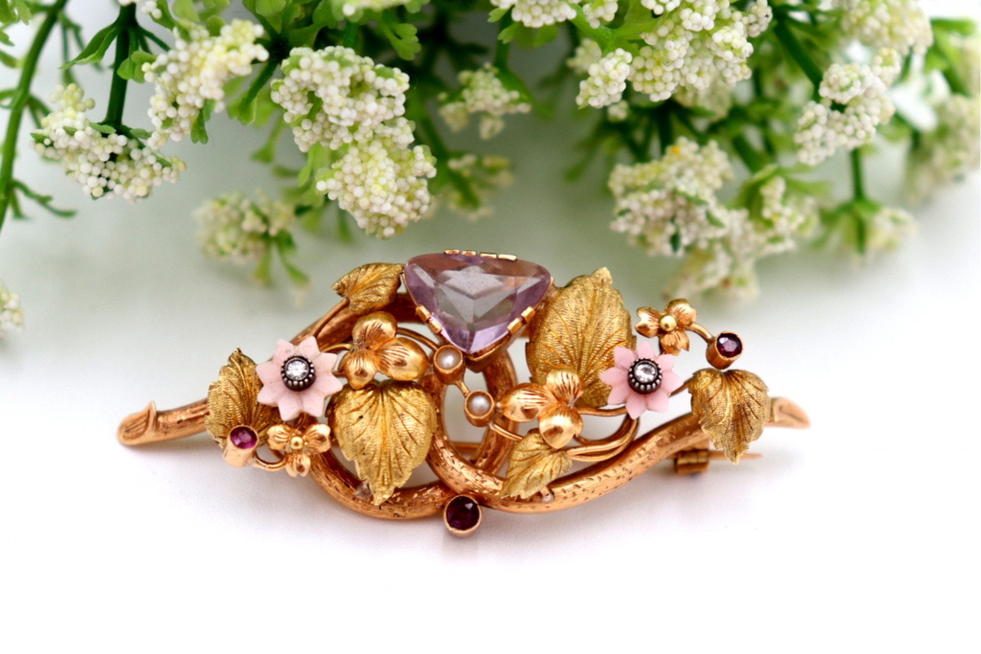 - Descrição: Pregadeira em ouro com folhas relevadas, corais recortados com dois brilhantes embutidos, ametista triangular lapidada, micro pérolas e rubis sintéticos.
