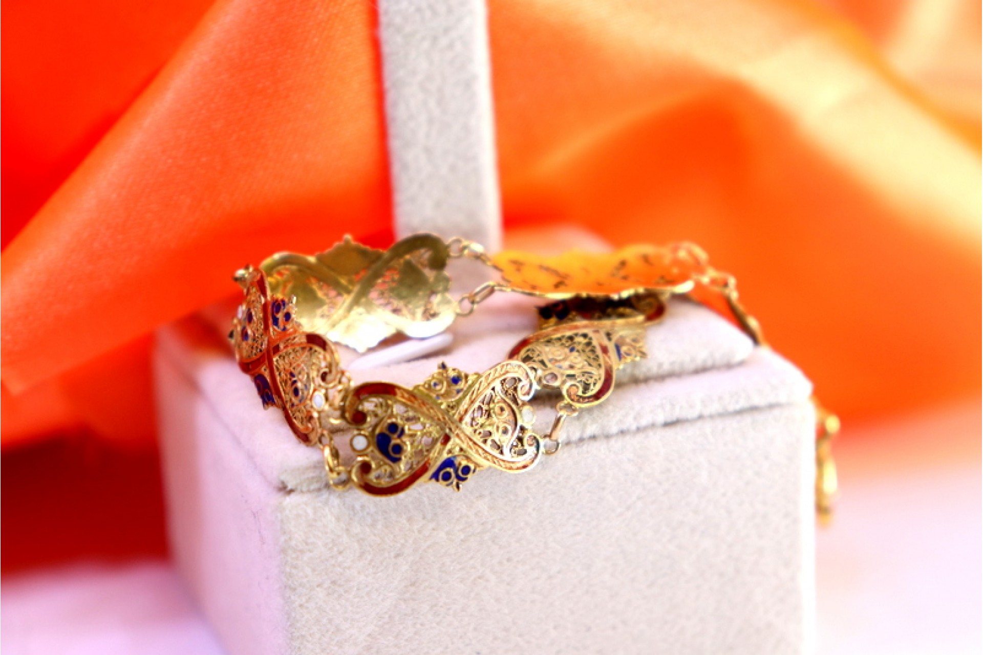 • Descrição: Pulseira em ouro esmaltada em tons de vermelho e azul com elos articulados.