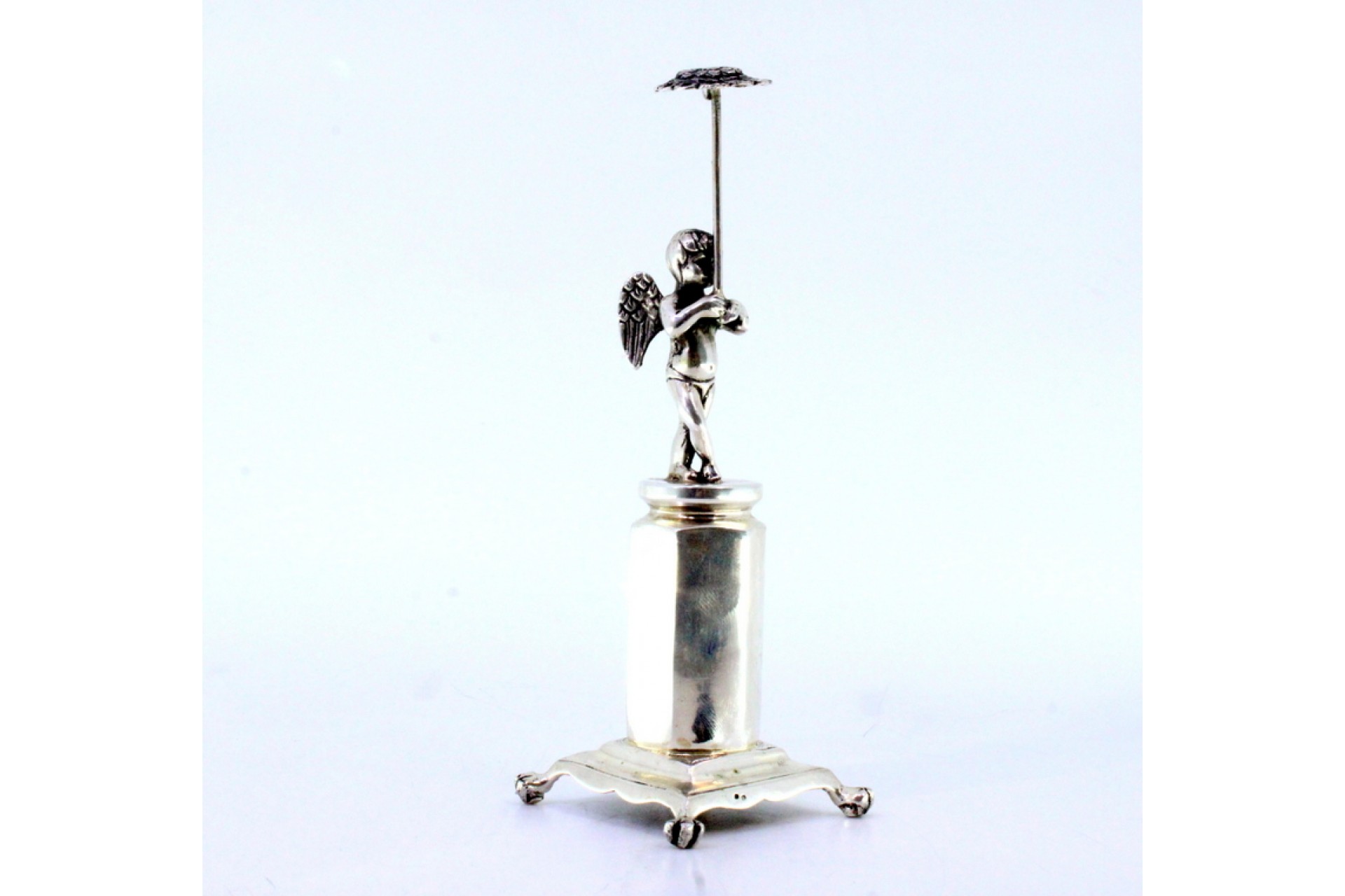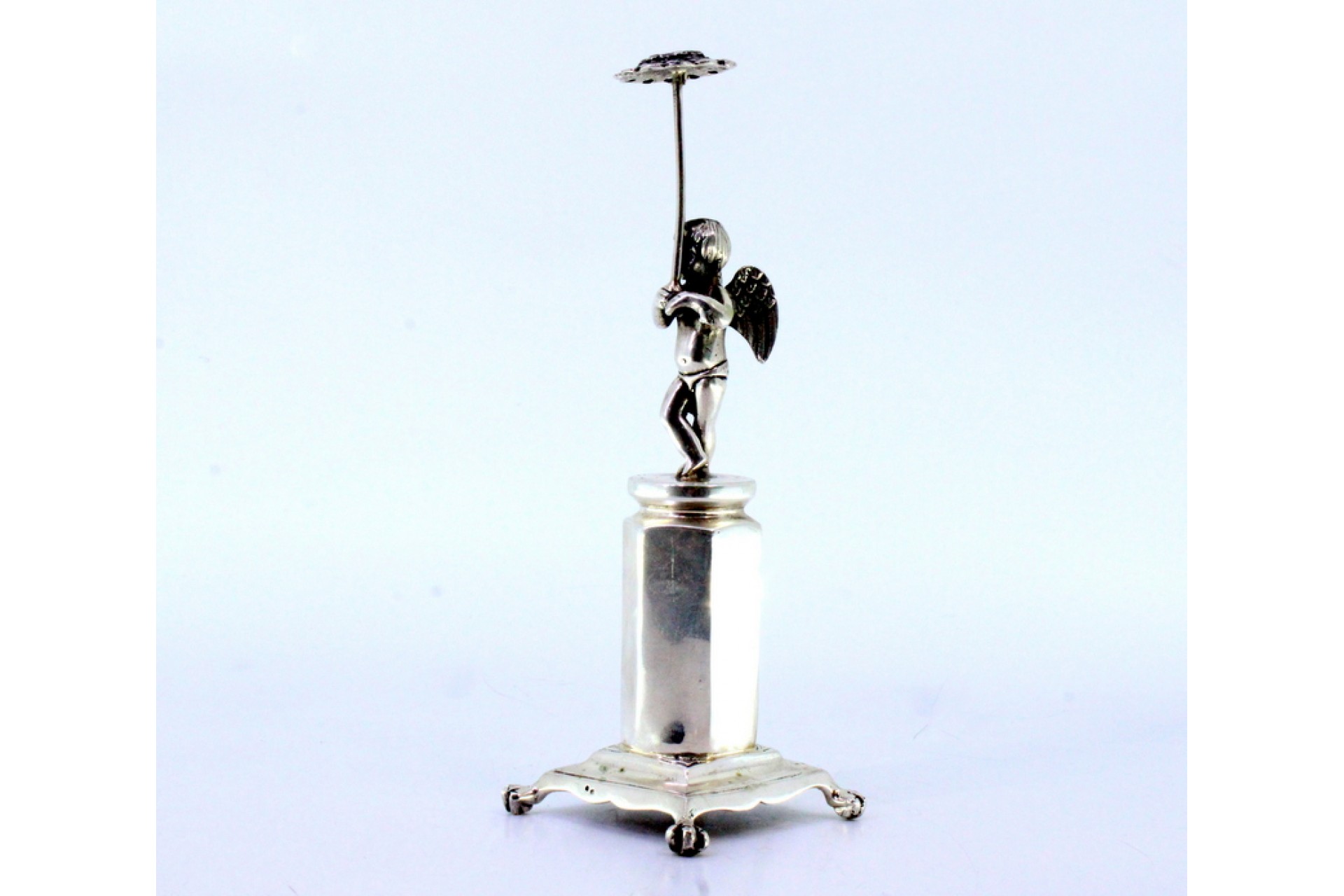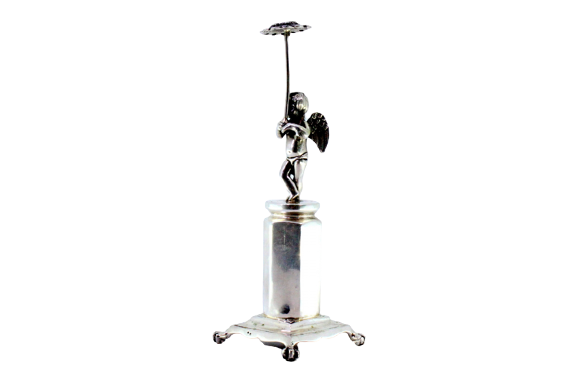 • Descrição: Paliteiro em prata com anjo em vulto perfeito segurando girassol sobre plinto sextavado e assente em quatro pés em forma de garras.