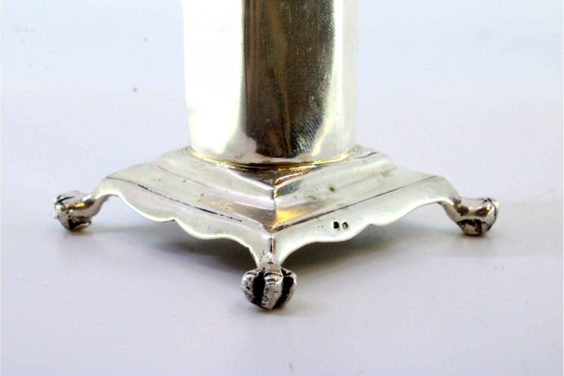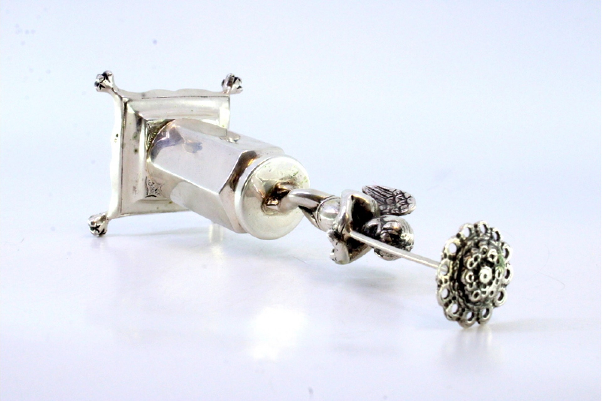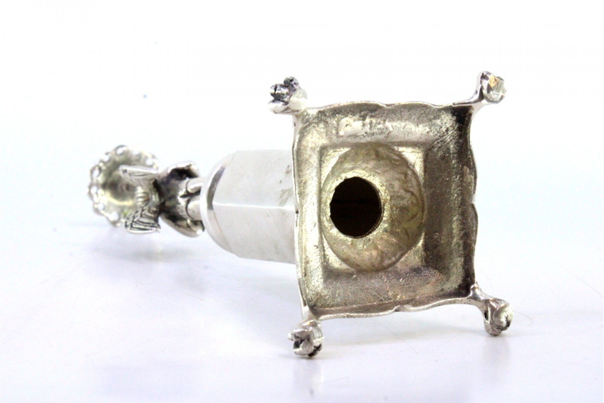 • Descrição: Paliteiro em prata com anjo em vulto perfeito segurando girassol sobre plinto sextavado e assente em quatro pés em forma de garras.
