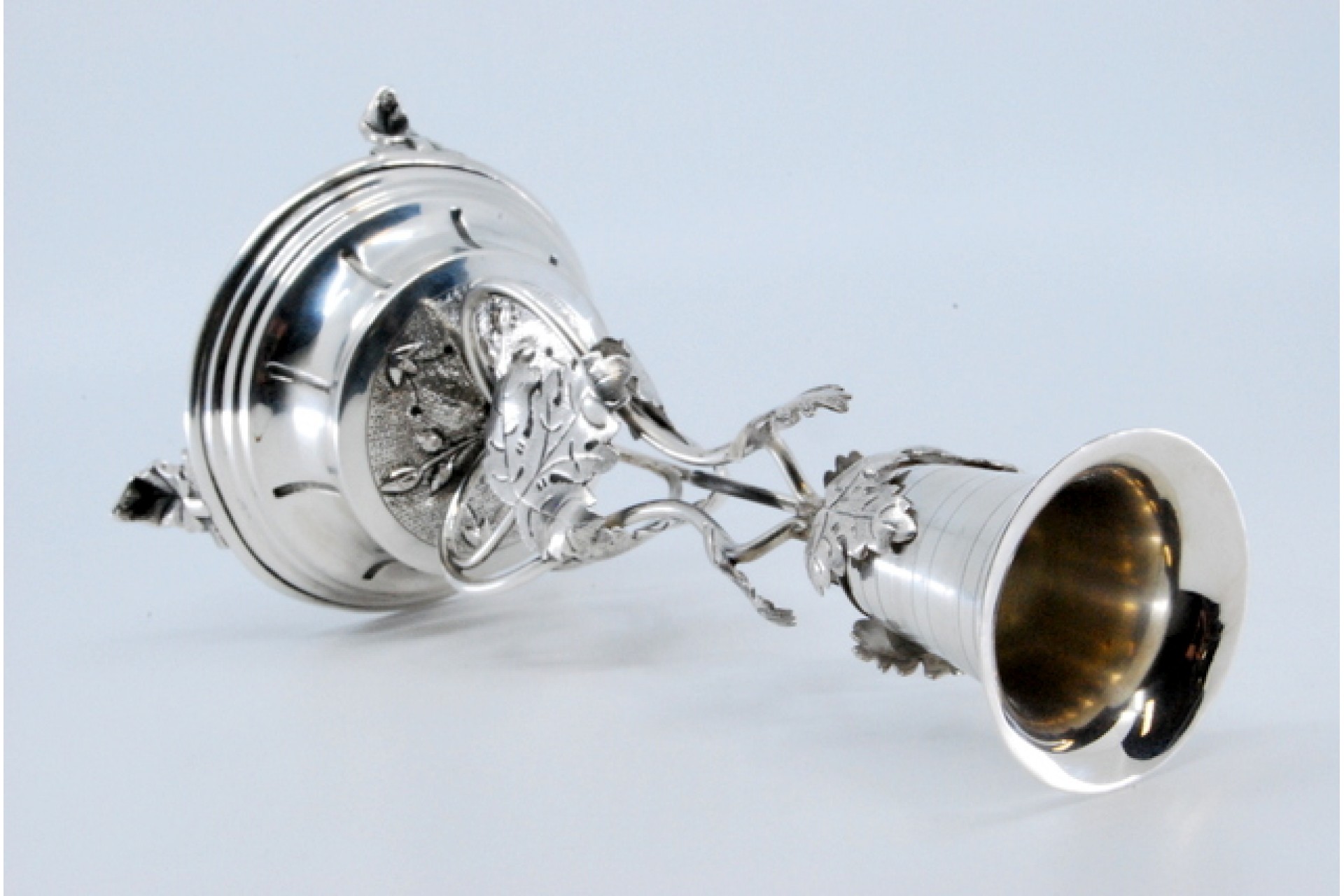 • Descrição: Paliteiro em prata com copo assente sobre trepadeira, base frisada e assente com três pés em forma de folhas.