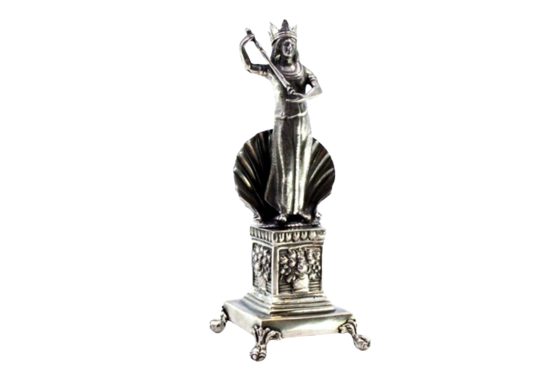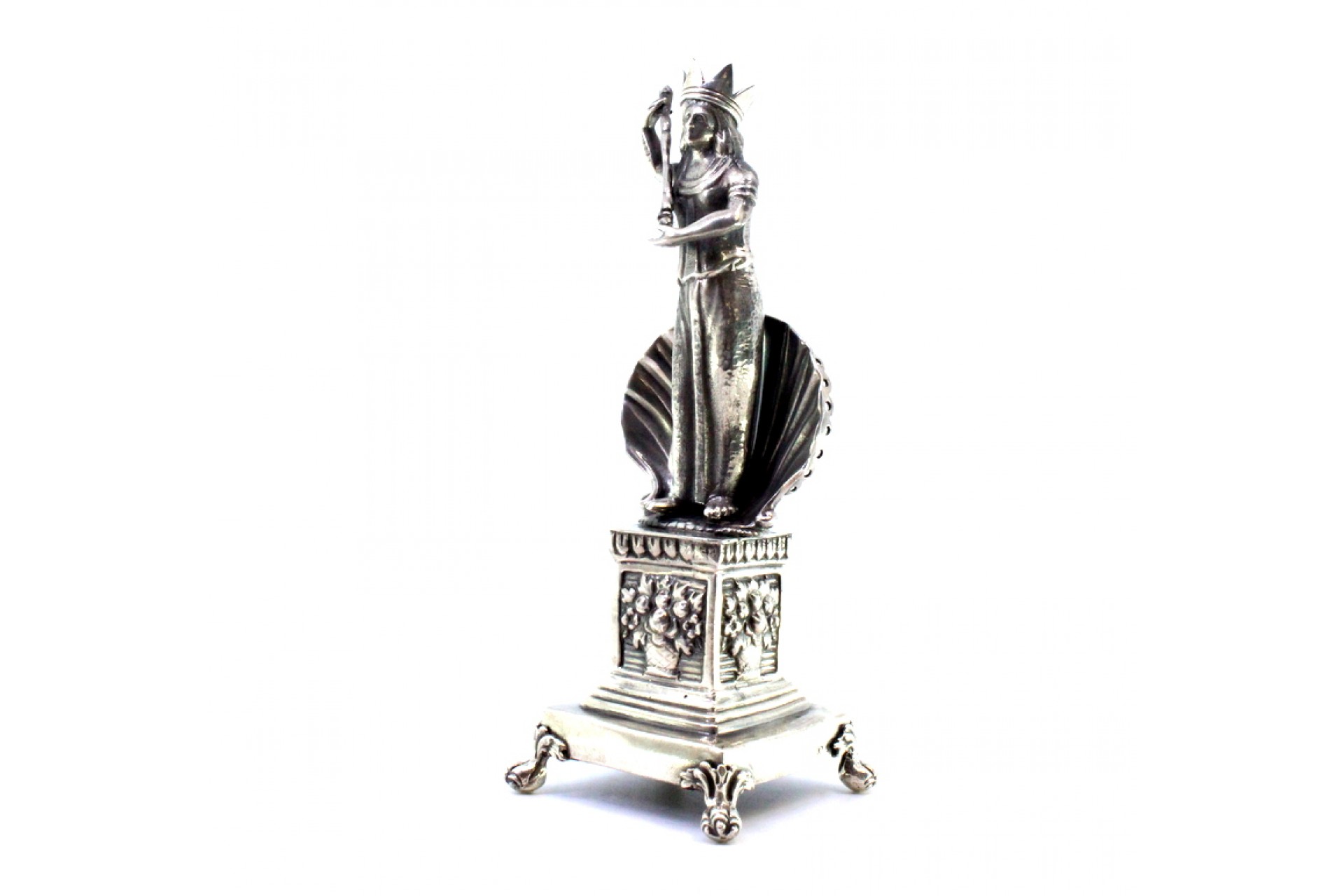 - Descrição: Paliteiro em prata com Anfitrite em pedestal com ceptro, com motivos florais relevados no plinto e assente em base quadrada com quatro pés em forma de garras.