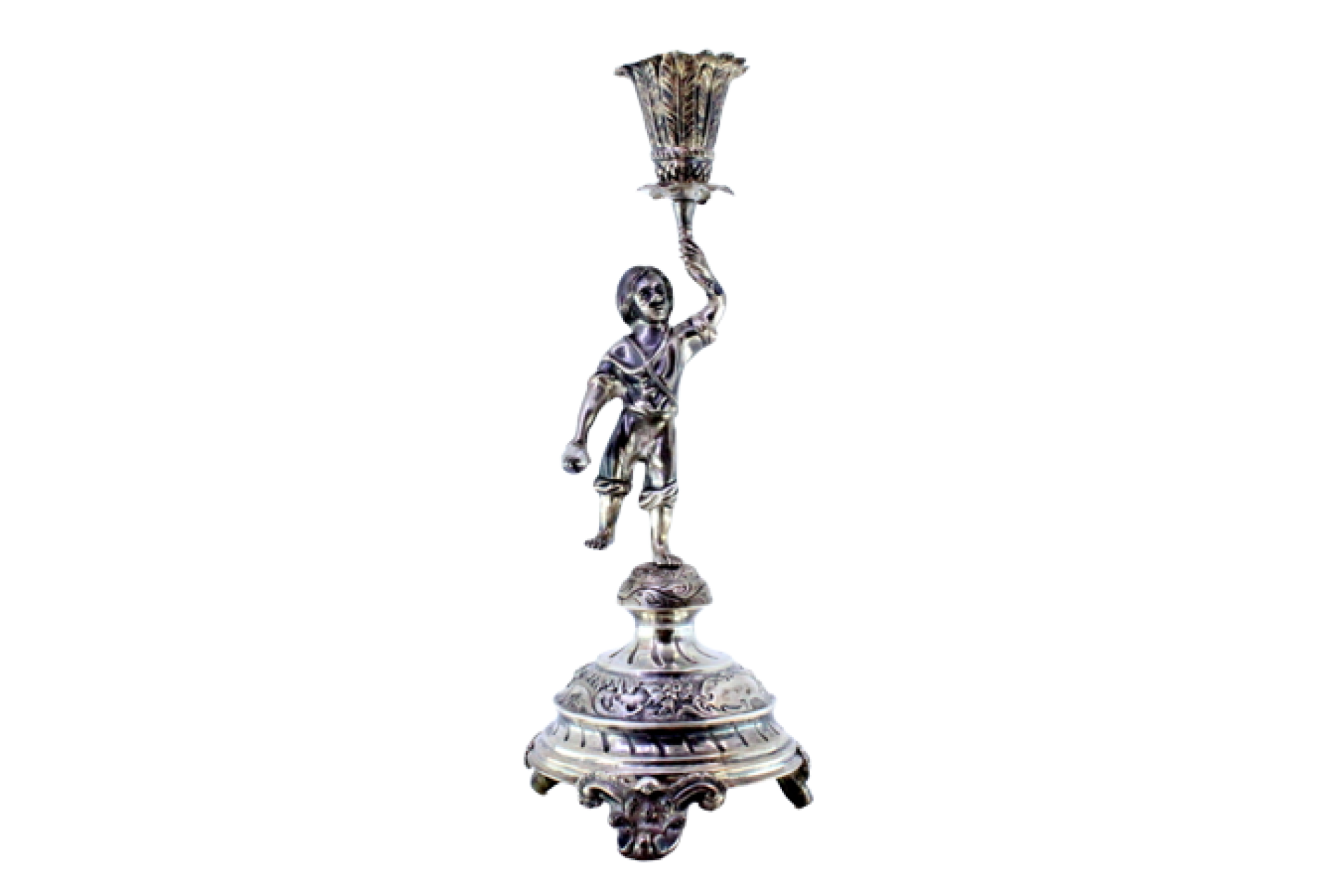 • Descrição: Paliteiro em prata com rapaz sobre plinto segundo cálice floreado e assente em base relevada com três pés.