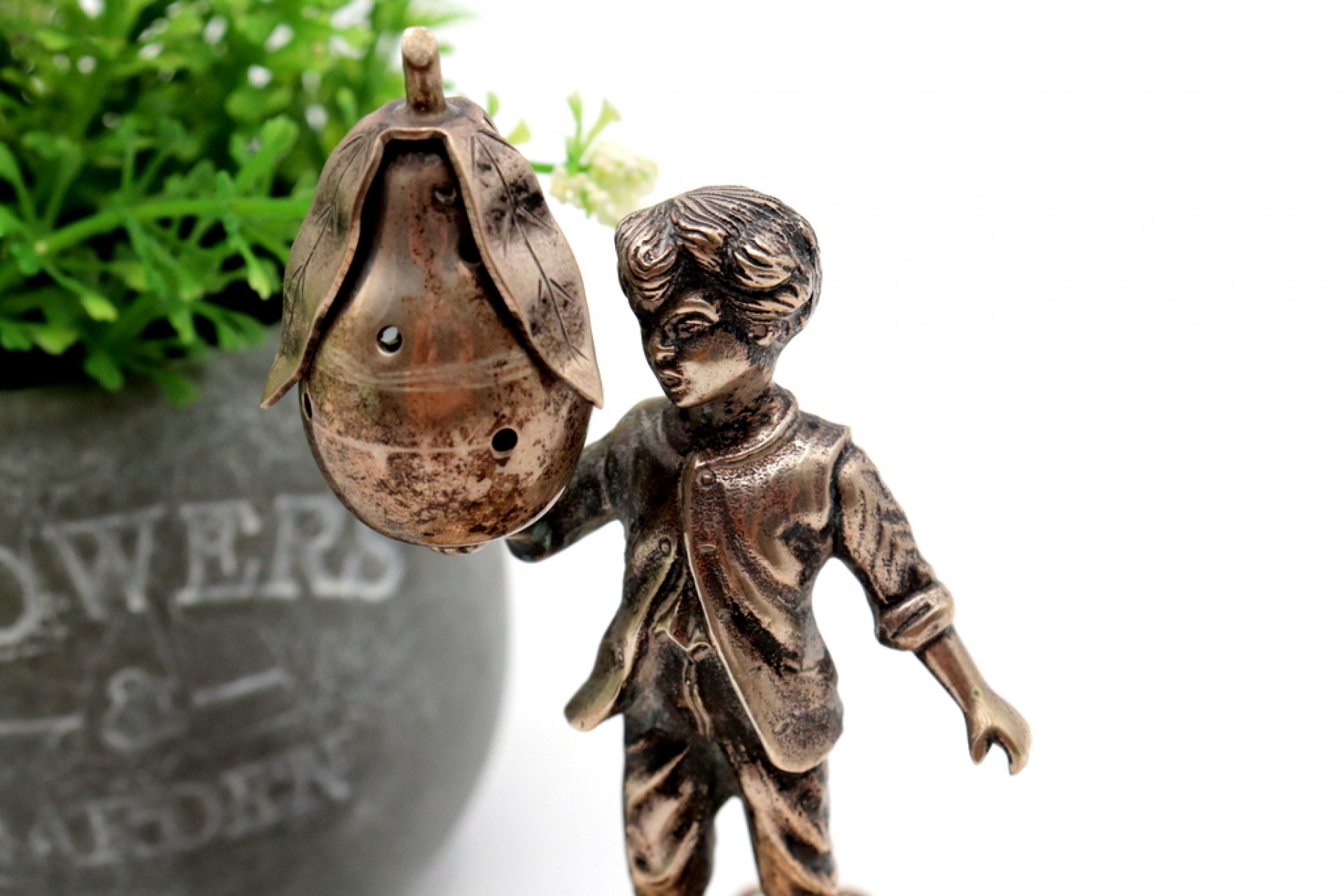 • Descrição: Paliteiro em prata com rapaz em pedestal segurando uma pera na mão base circular em gradinha e três pés.